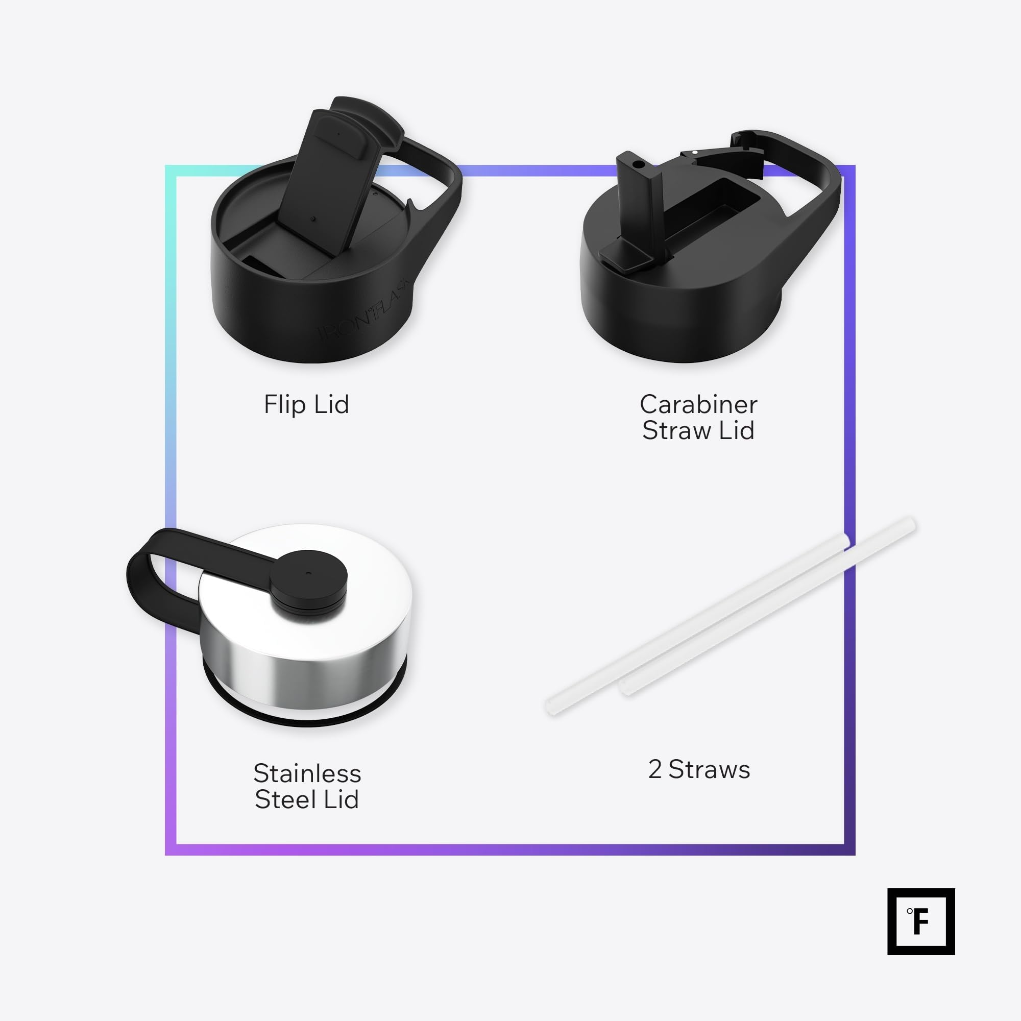- 3 מכסים: כן, Iron Flask מגיע עם שלושה מכסים שונים אטומי דליפות. מכסה קשית עם 2 קשיות, מכסה נפתח ומכסה נירוסטה! *הערה: מכסה הנירוסטה עשוי מפלסטיק מבפנים ופלדת אל-חלד מבחוץ*