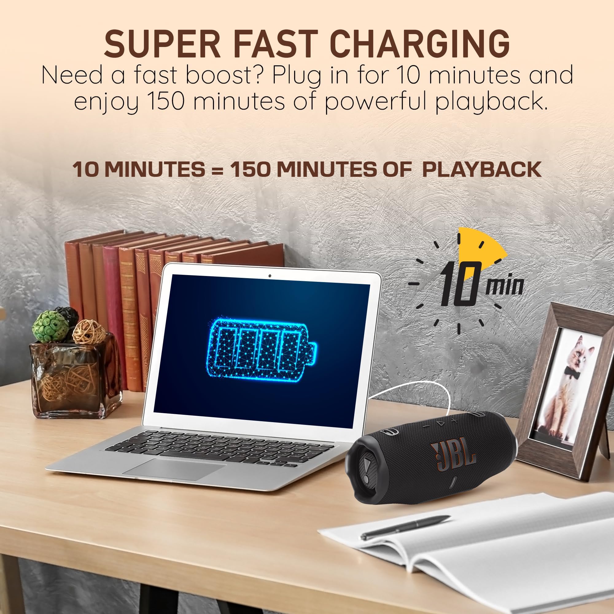 Additional Details Fast charge for 10 minutes for up to 150 minutes of playback Removable handle strap for easy carrying