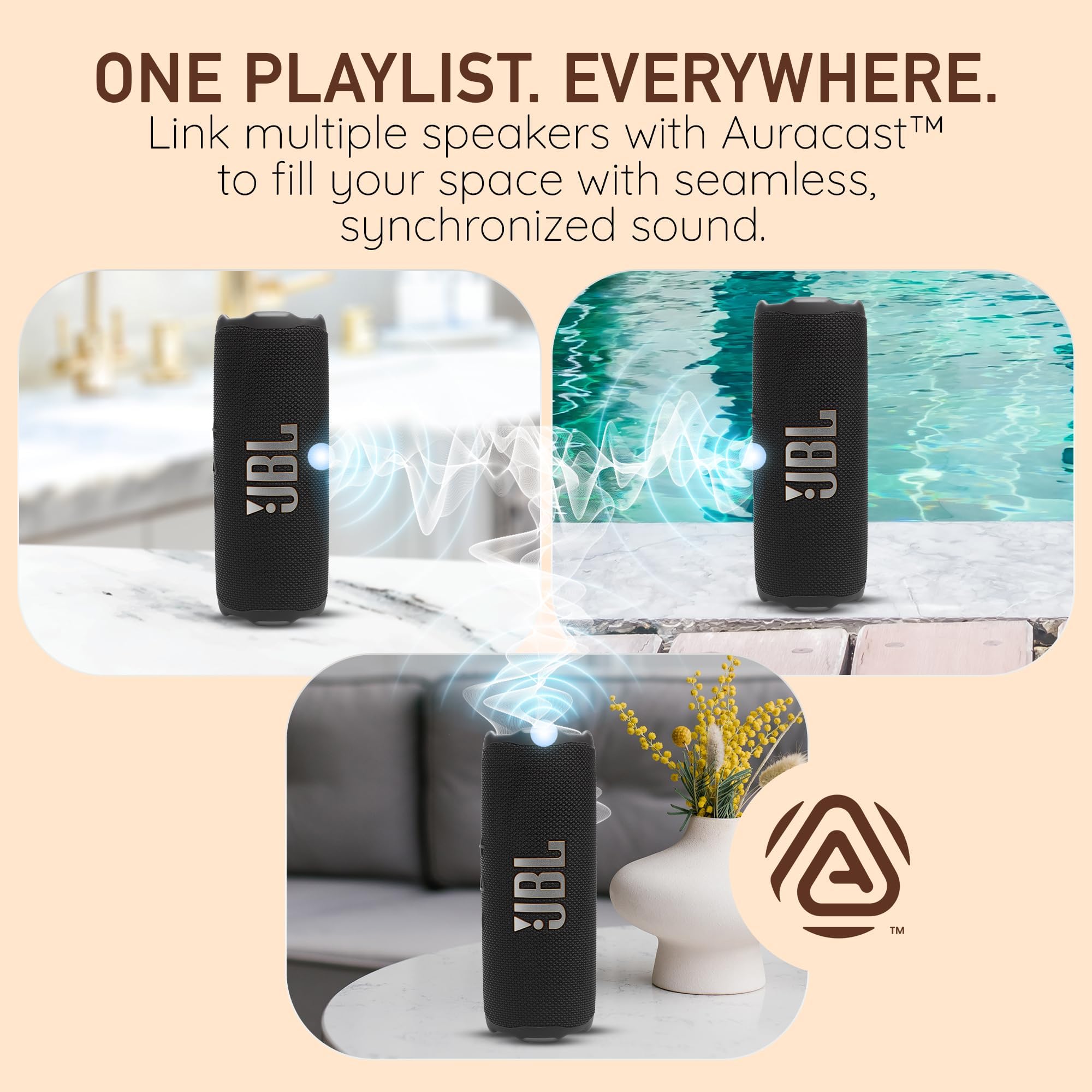 Flip 7 supports Auracast technology to make sharing music super simple. Auracast is a Bluetooth feature that broadcasts audio to an unlimited number of JBL Auracast-enabled speakers that are in range; all without the typical chore of pairing the speakers together. Enjoy true stereo sound with a second Flip 7 or keep adding more compatible speakers for the largest parties.