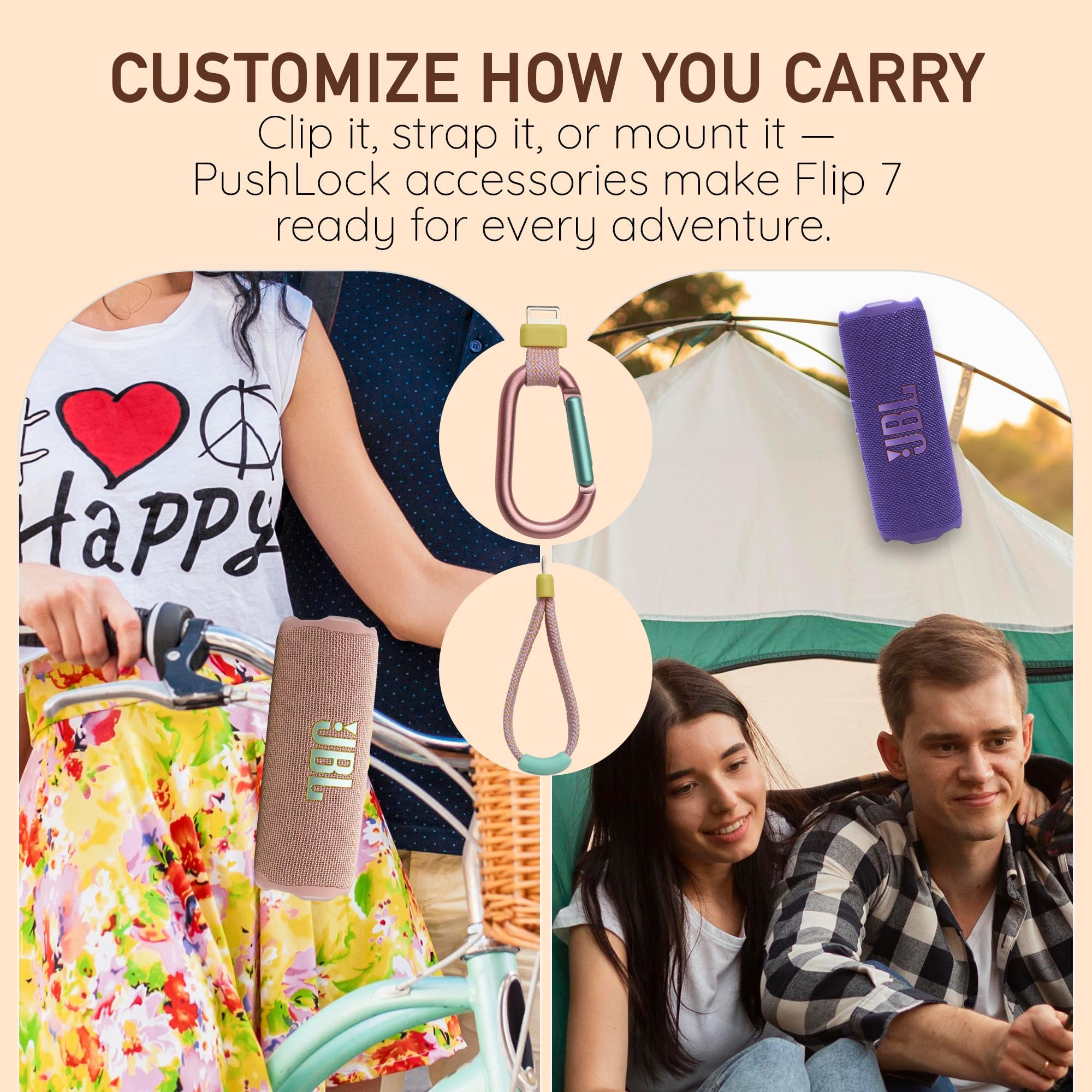 Using JBL's PushLock system, you can make the Flip 7 your own with interchangeable accessories. A strap and carabiner are included to make it easier to carry hands-free, whether it's around your wrist or hanging from a backpack.