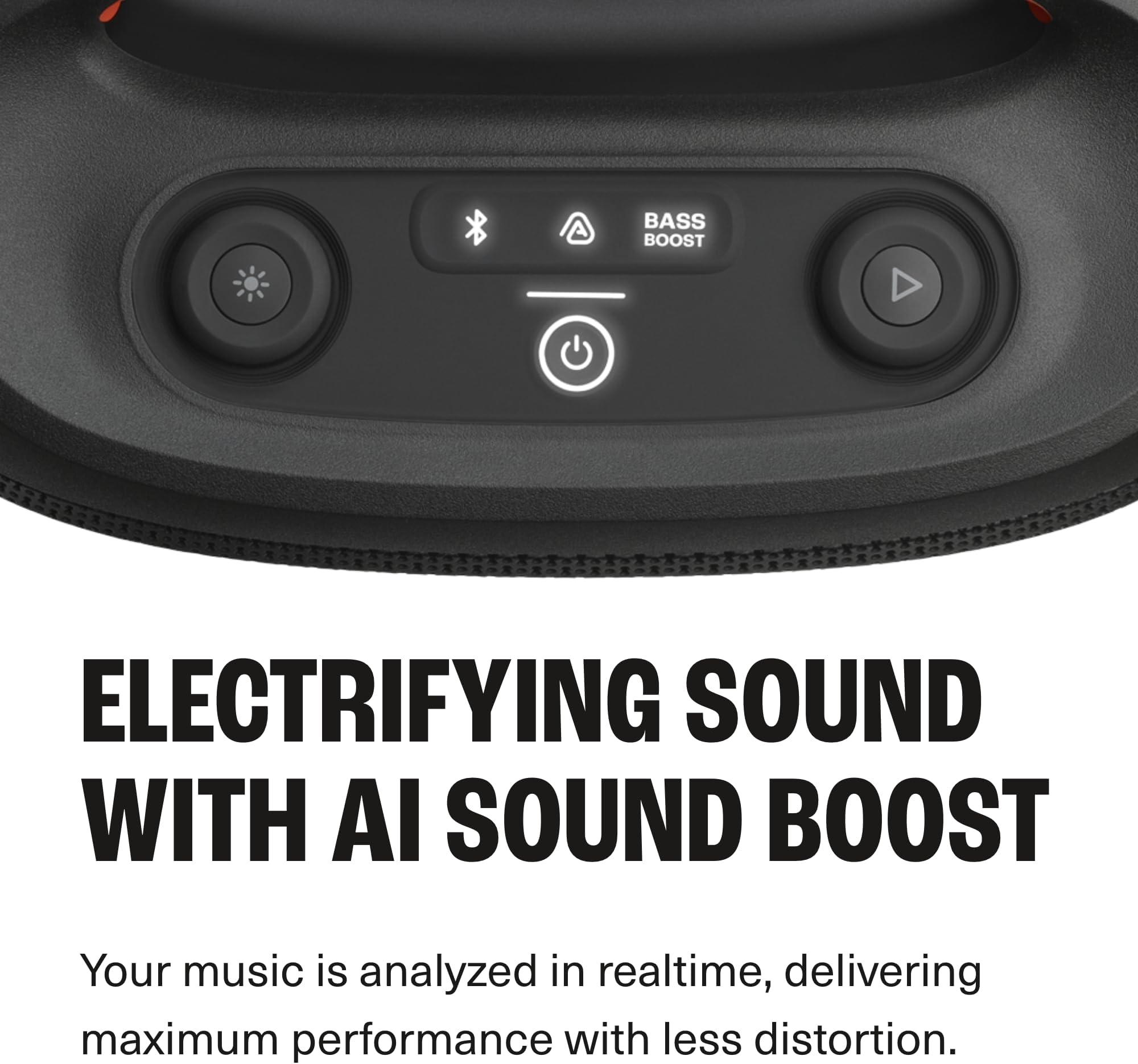 Pop ballads, slow jams, and everything in between, your playlist will shine with JBL Pro Sound. Feel the extra oomph in your chest as silk dome tweeters and powerful woofers deliver epic highs and deep lows.The AI Sound Boost ensures your music remains crystal clear with more powerful sound and less distortion.