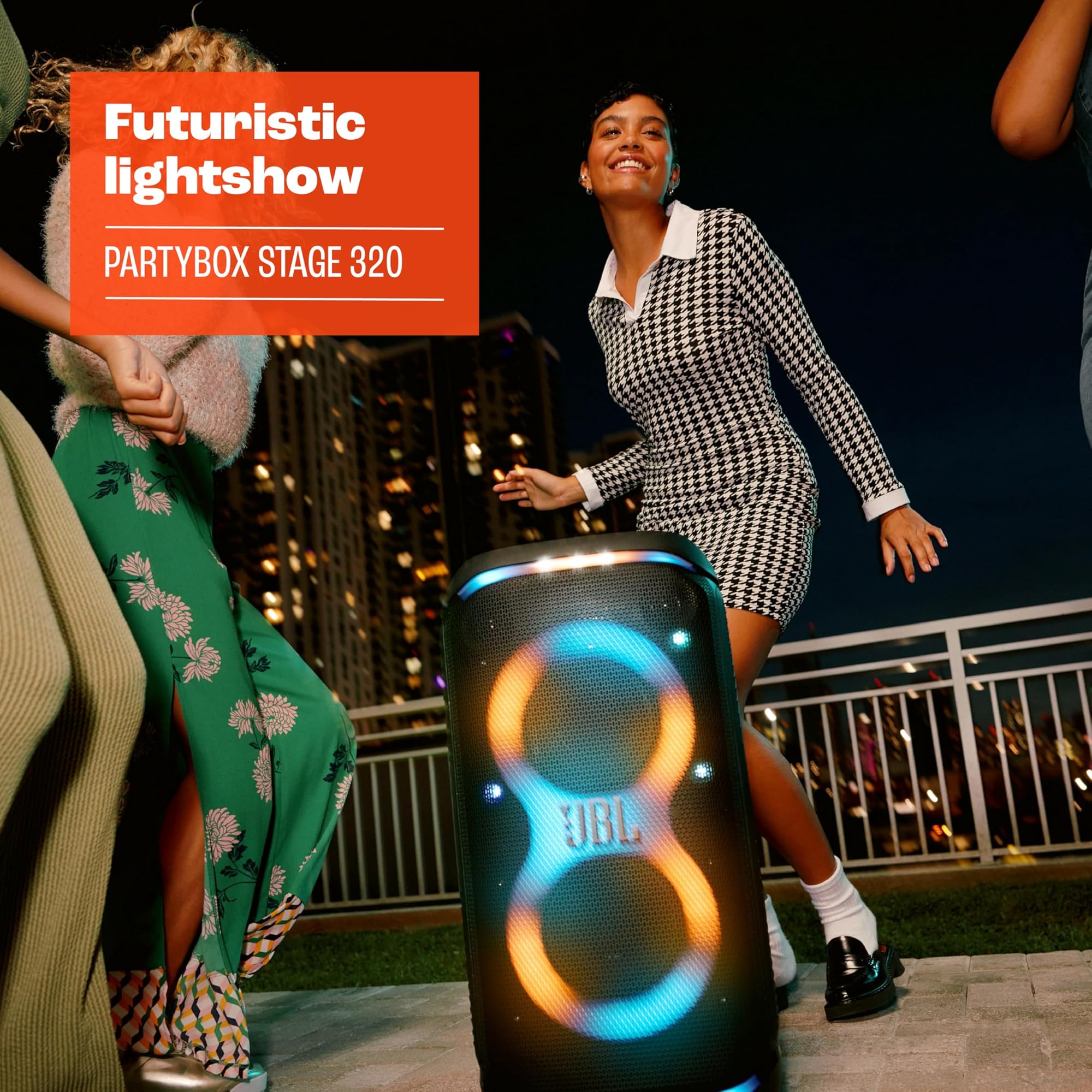 JBL PartyBox Stage 320 - Portable Party Speaker with Telescopic Handle & Wide, Sturdy Wheels, Powerful JBL Pro Sound, Futuristic lightshow, Up to 18 Hours of Play time, Splash Proof (Black)
