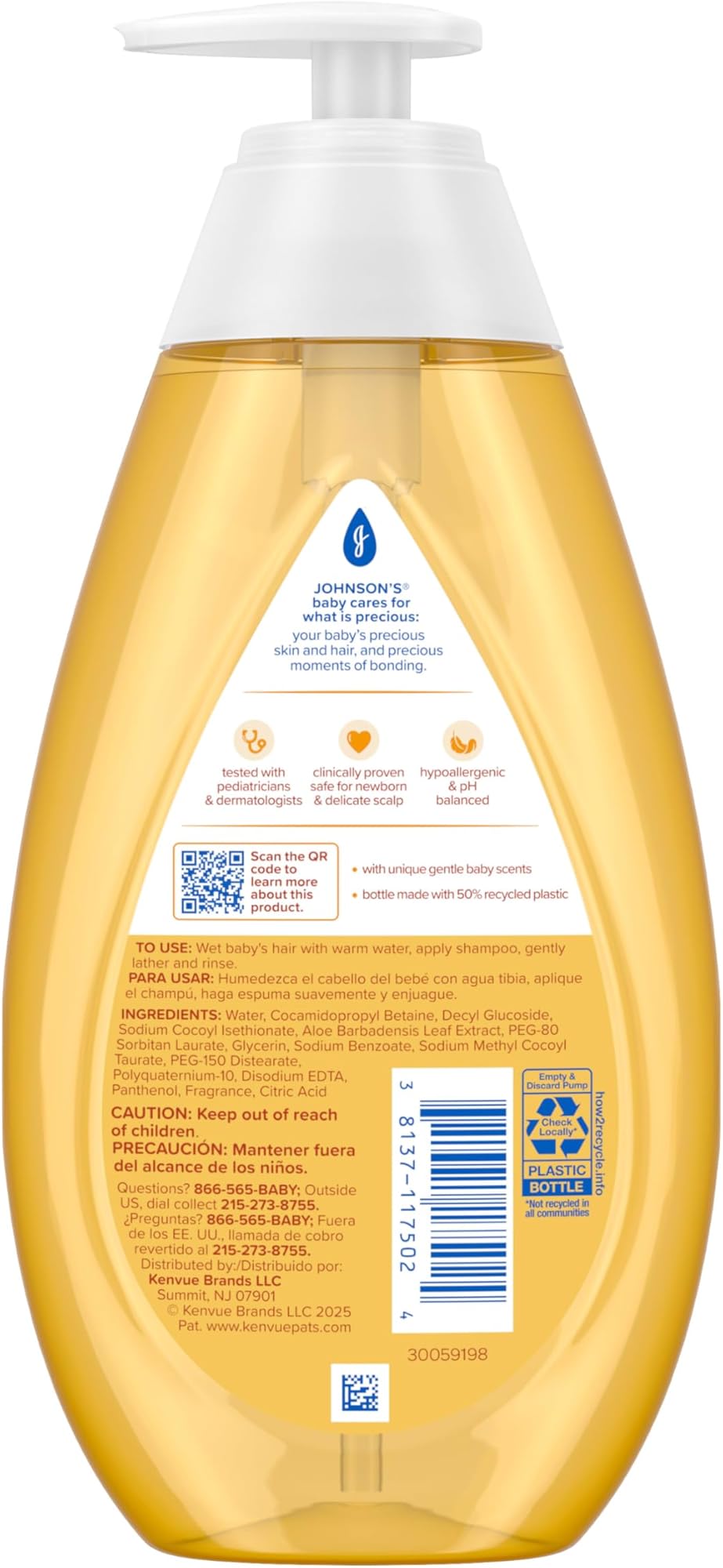 נקו בעדינות את שיער תינוקכם עם שמפו התינוקות של ג'ונסון - שמפו עדין, ללא דמעות, שתוכנן במיוחד לשיער תינוקות דק וקרקפת עדינה. שמפו זה, שהוכח קלינית כבטוח לתינוקות ועדין מספיק לכל המשפחה, שוטף לכלוך והצטברויות ומשאיר את שיער התינוק רך, מבריק ונקי. שמפו היפואלרגני זה, המועשר באלוורה וויטמין B5, מסייע בשמירה על הלחות הטבעית של השיער והקרקפת. נוסחת No More Tears עדינה לעיניים כמו מים טהורים. ניתן להשתמש בשמפו התינוקות של ג'ונסון כחלק משגרת הטיפוח היומית שלכם לניקוי עדין של שיער וקרקפת עדינים של התינוק. חלק משגרת אמבטיה מושלמת בת 3 שלבים: שמפו עם שמפו התינוקות של ג'ונסון, תרחיץ עם תרחיץ ושמפו לתינוקות של ג'ונסון מכף רגל ועד ראש, הענק לחות עם קרם תינוקות של ג'ונסון. ארוז בבקבוק העשוי מ-50% פלסטיק ממוחזר. הוראות שימוש: הרטיבו את שיער התינוק הדק במים חמים. מרחו שמפו, הקציפו בעדינות ושטפו היטב. הפורמולה שלנו: פורמולה, כעת עם אלוורה וויטמין B5: פורמולה עם אלוורה וויטמין B5 משאירה את השיער והקרקפת בתחושה מזינים ובריאים. היפואלרגני ובעל רמת חומציות מאוזנת. ללא פרבנים, סולפטים וצבעי מאכל. נבדק על ידי רופאי ילדים; מיוצר עם ניחוחות עדינים ייחודיים לתינוקות. סיפור המותג: ג'ונסון בייבי דואגת למה שיקר: עורו ושיערו היקרים של תינוקך, ולרגעים יקרים של יצירת קשר. במשך למעלה מ-125 שנה, אנו מחויבים ליצירת מוצרי טיפוח לתינוקות עדינים ומבוססים במדע, התומכים ברגעי יצירת קשר שמחים ובריאים. מותג טיפוח התינוקות והילדים מספר 1 בעולם* *מקור: Euromonitor International Limited; יופי וטיפוח אישי מהדורת 2025. לפי קטגוריית מוצרים ספציפיים לתינוקות ולילדים; כל ערוצי הקמעונאות; מכירות במחיר מומלץ לצרכן; נתוני 2024.