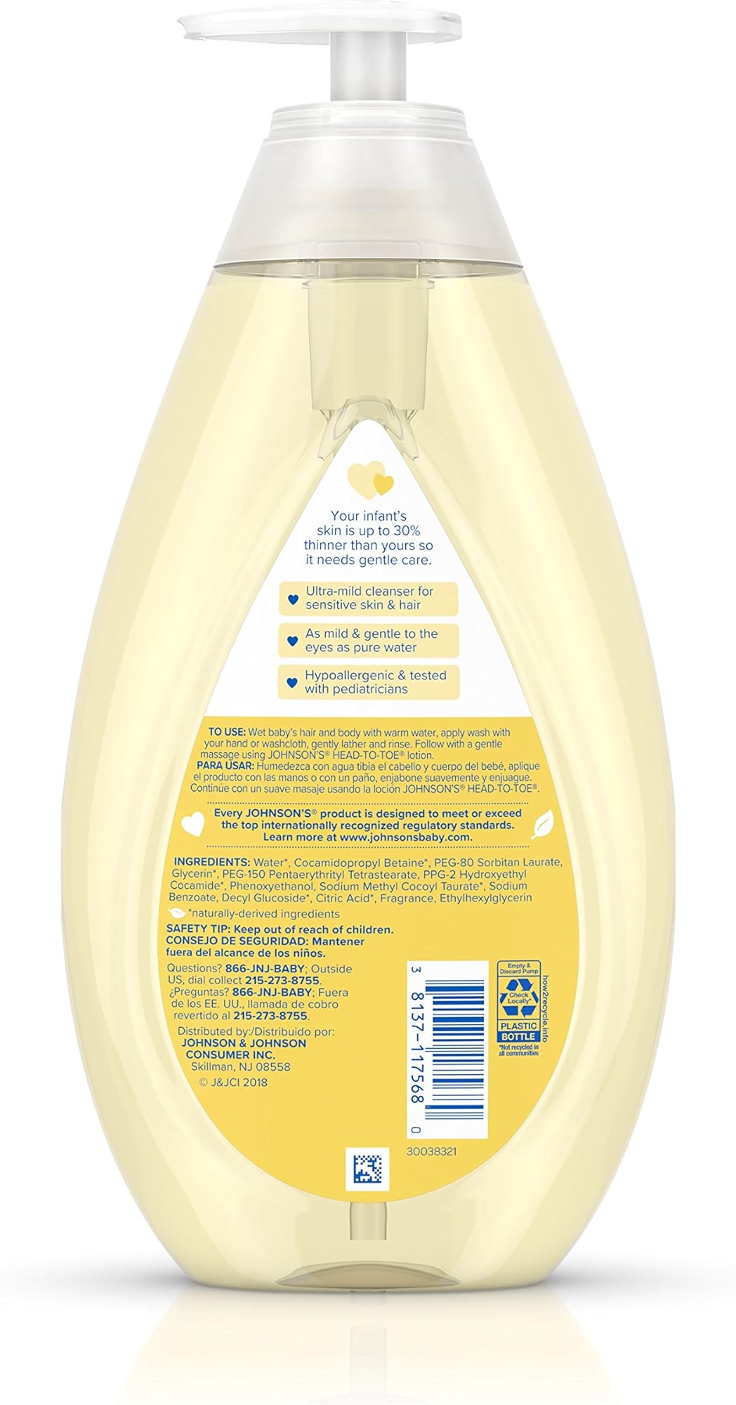 סבון ושמפו עדין לתינוקות ותינוקות של ג'ונסון מכף רגל ועד ראש ללא דמעות, ללא סולפטים, פרבנים, פתלטים וצבעי מאכל, סבון היפואלרגני לעור ושיער רגישים, 27.1 אונקיות נוזל