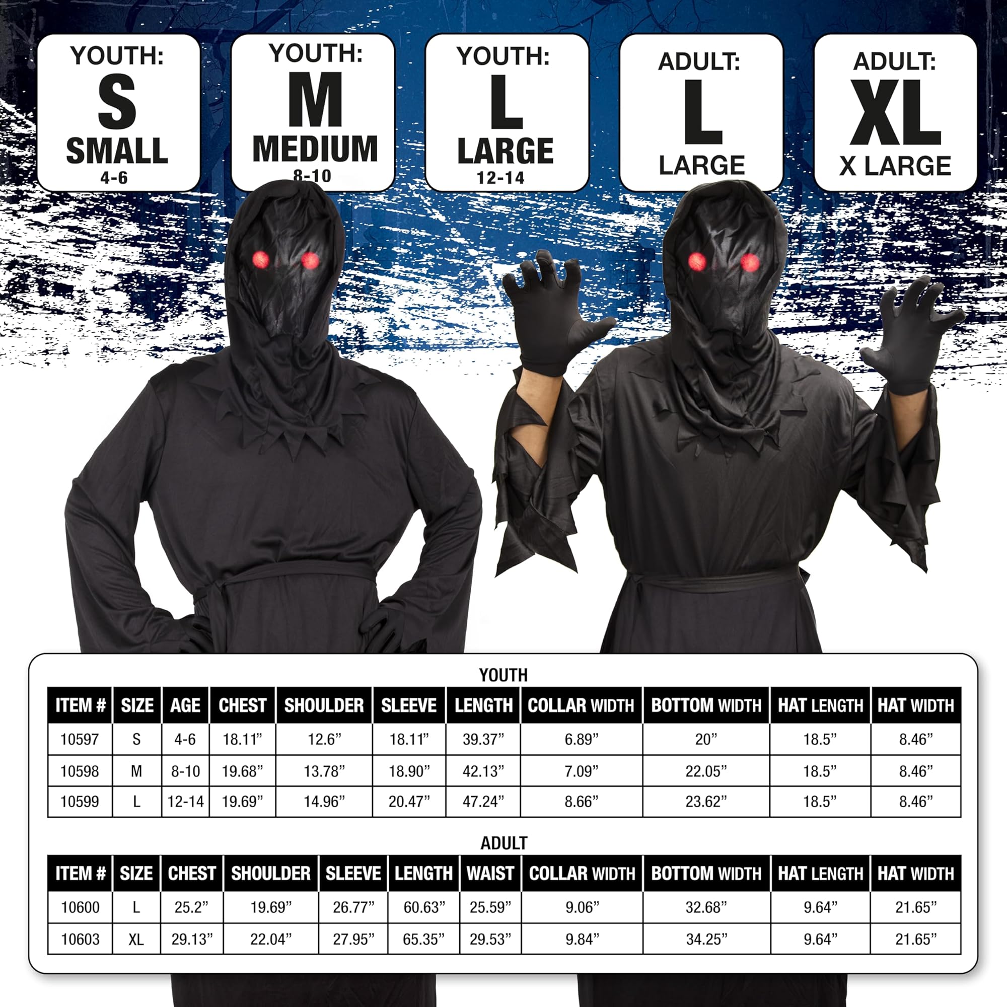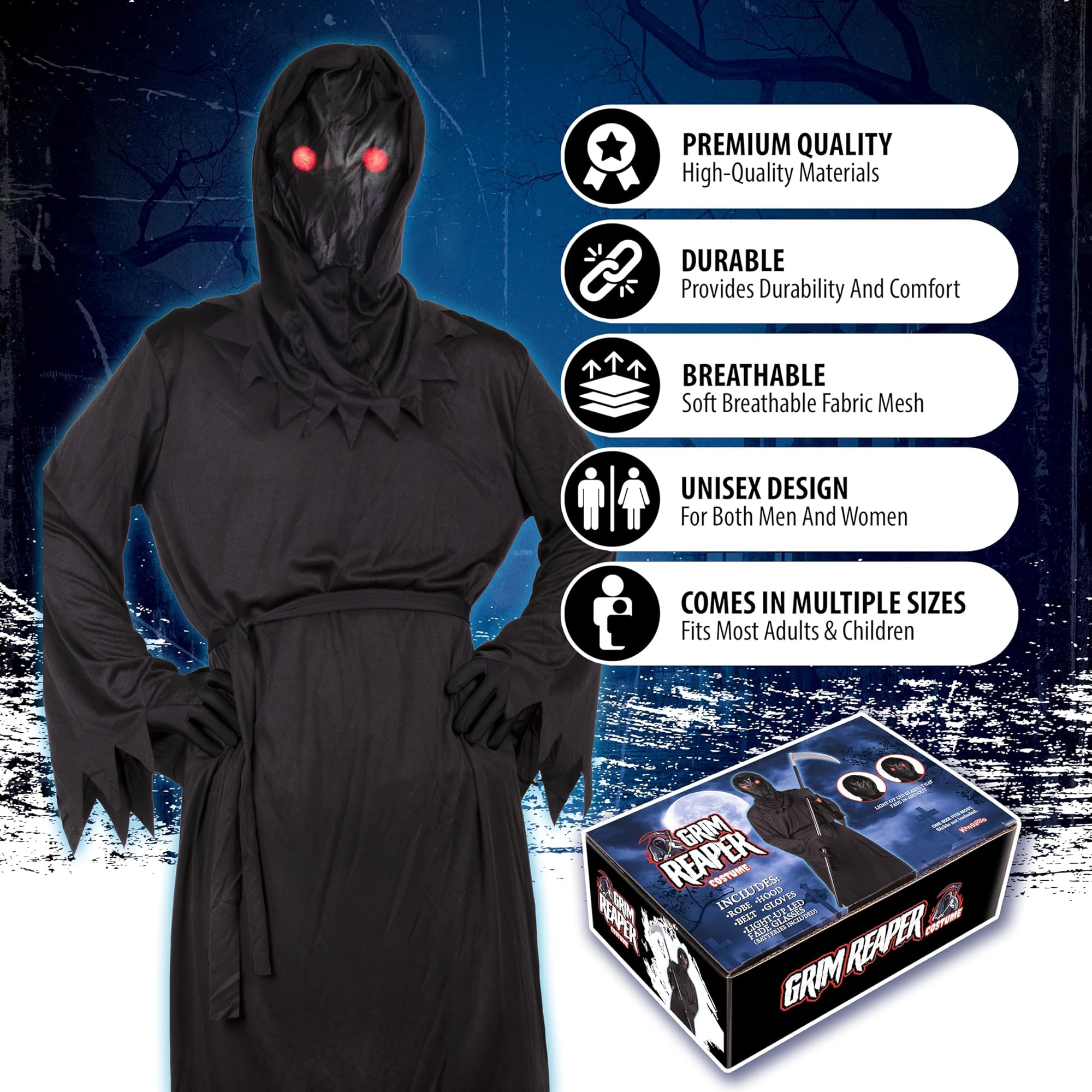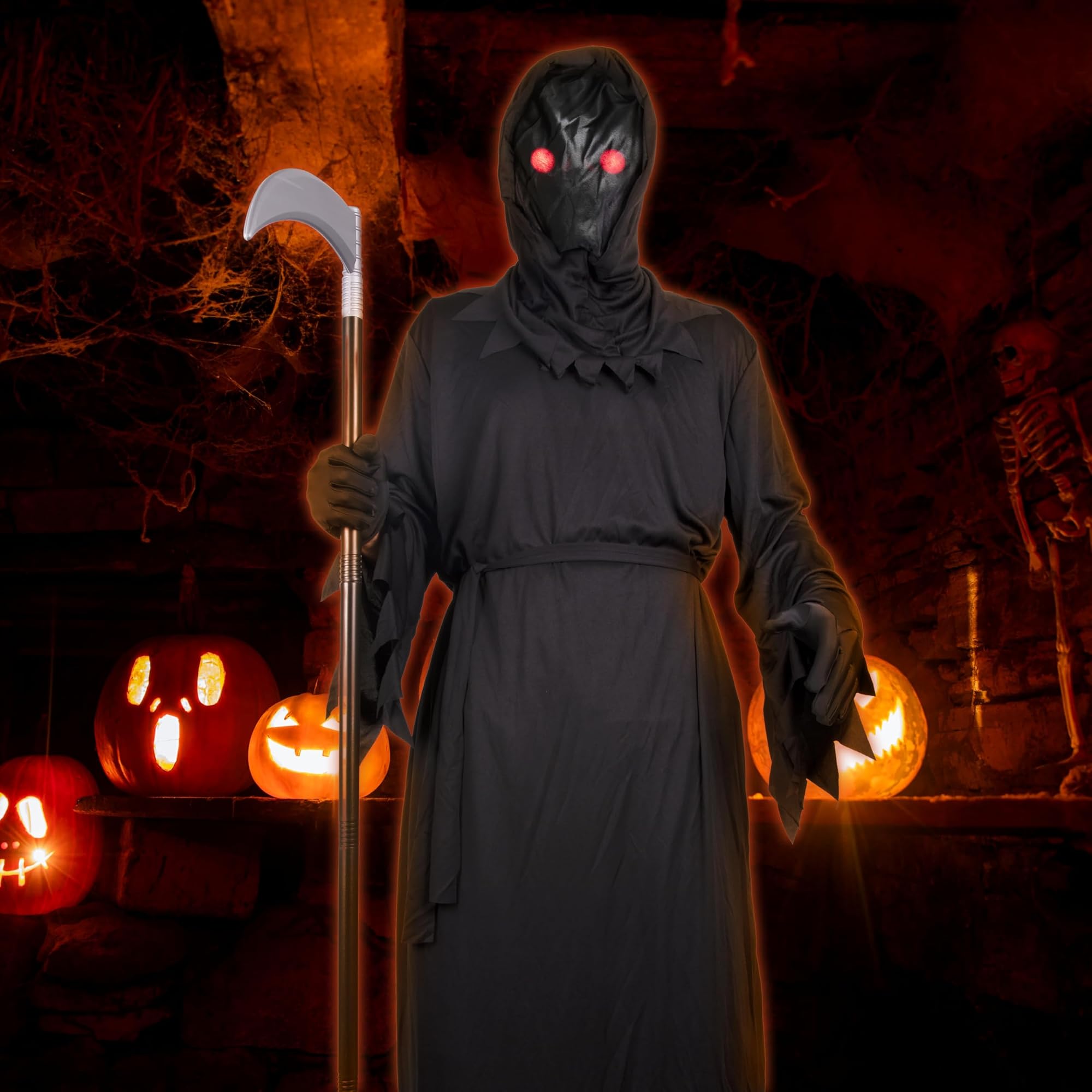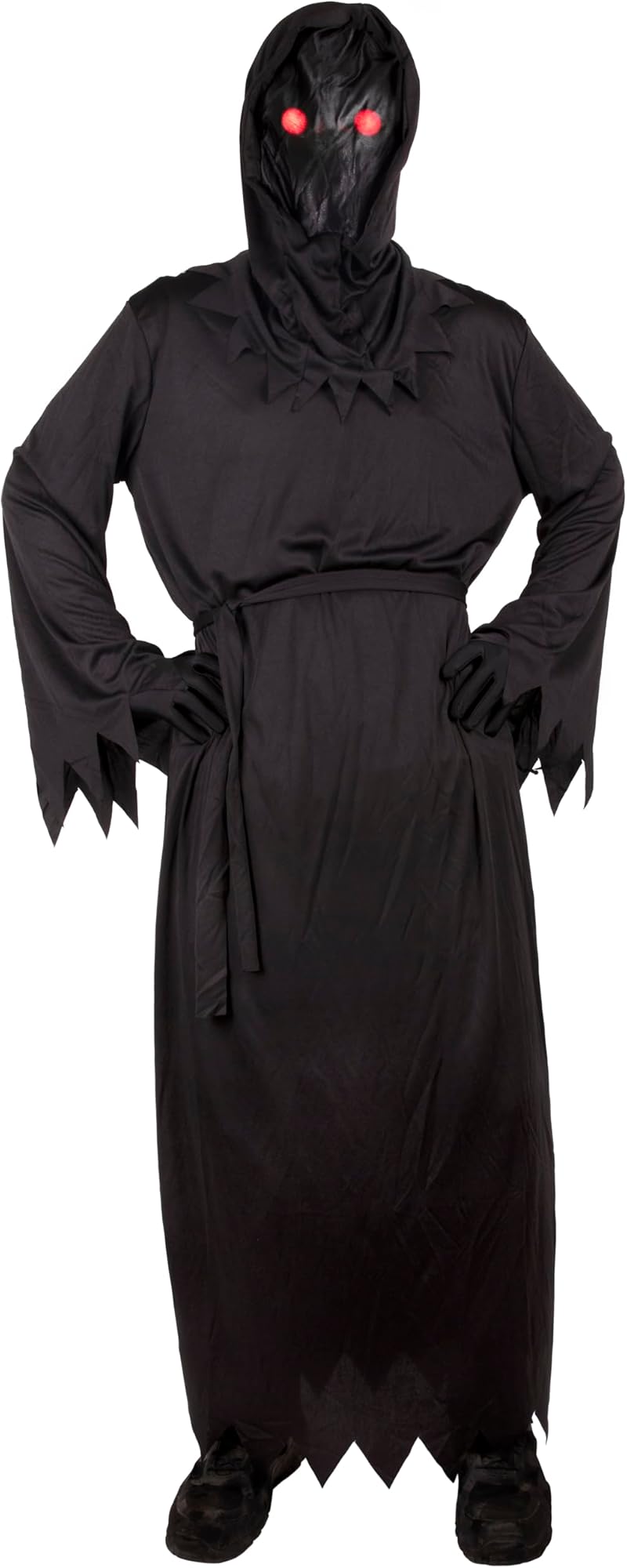- תחפושות ליל כל הקדושים מפחידות למבוגרים מגיעות עם חבילה הכוללת גלימה שחורה, ברדס, חגורה, כפפות, משקפי LED מוארים ודהויים למבוגרים