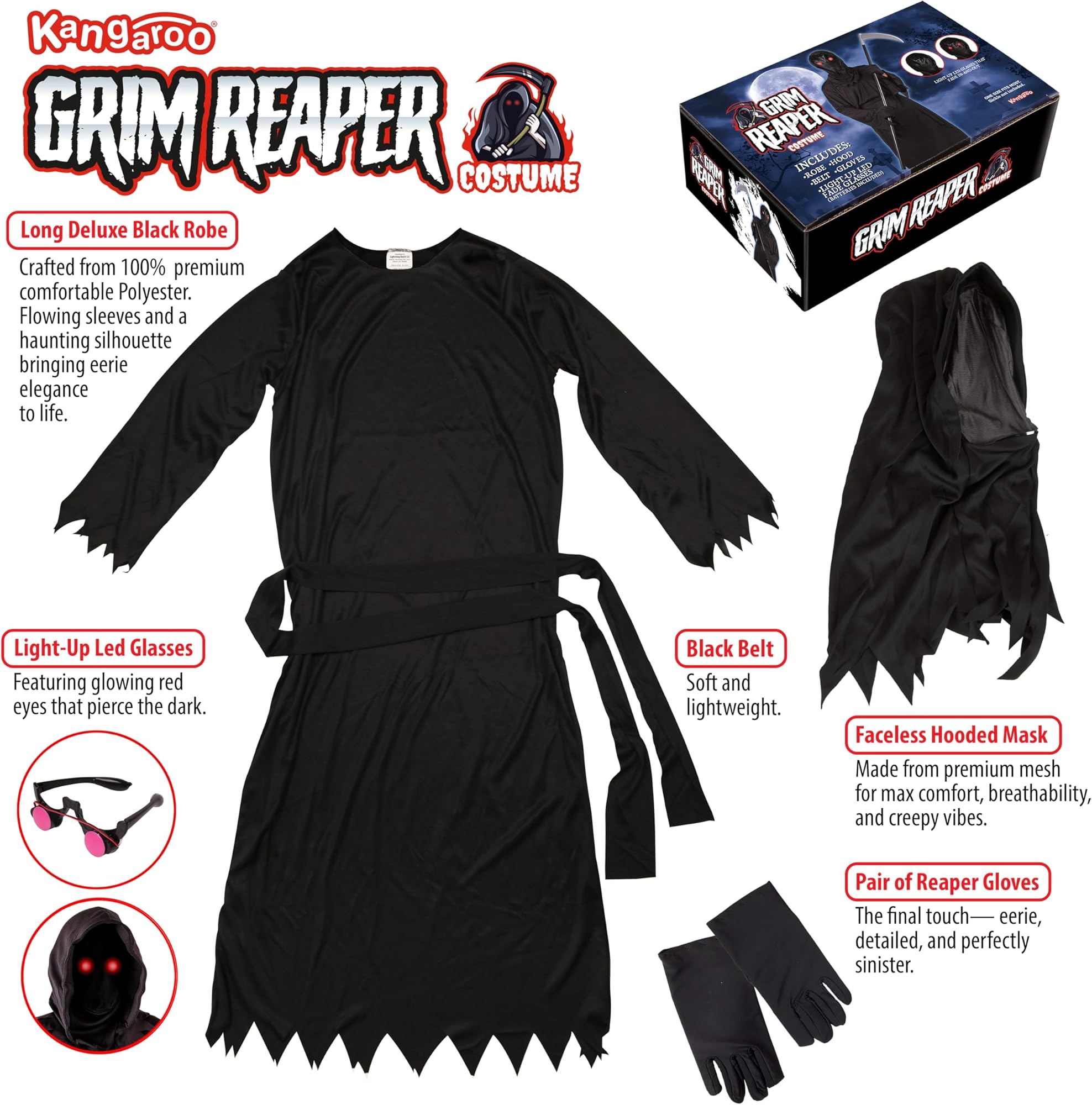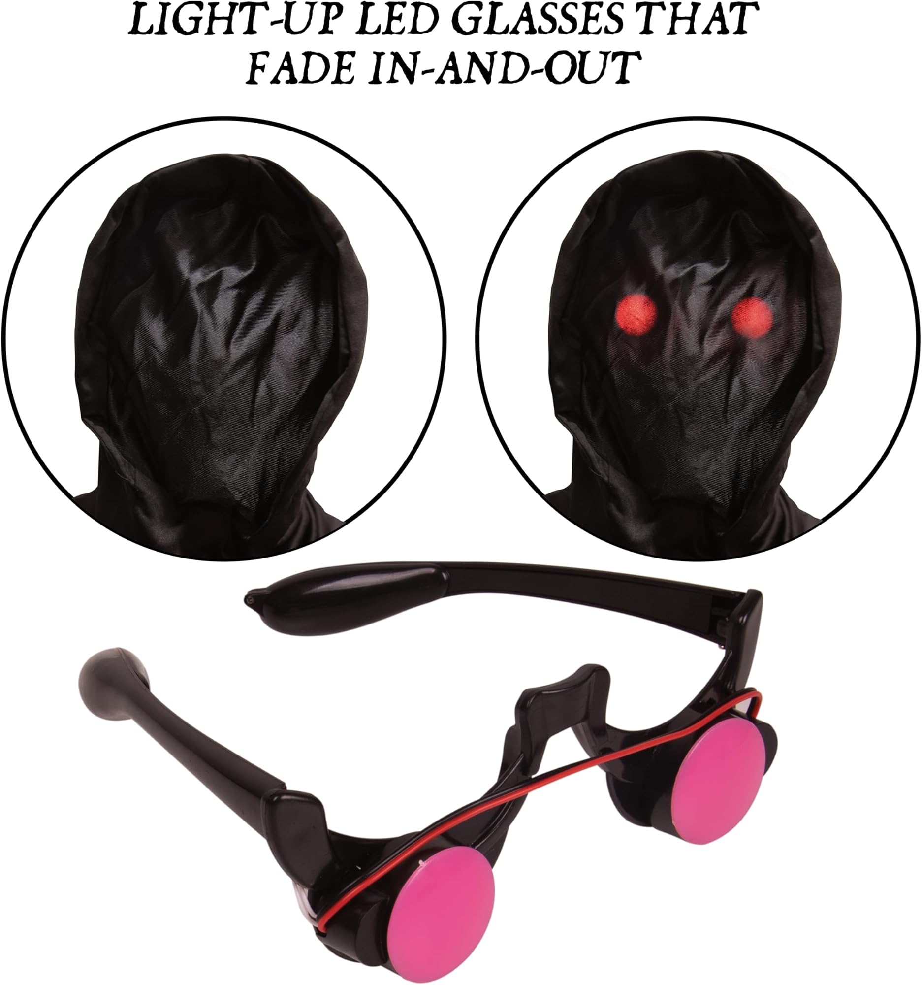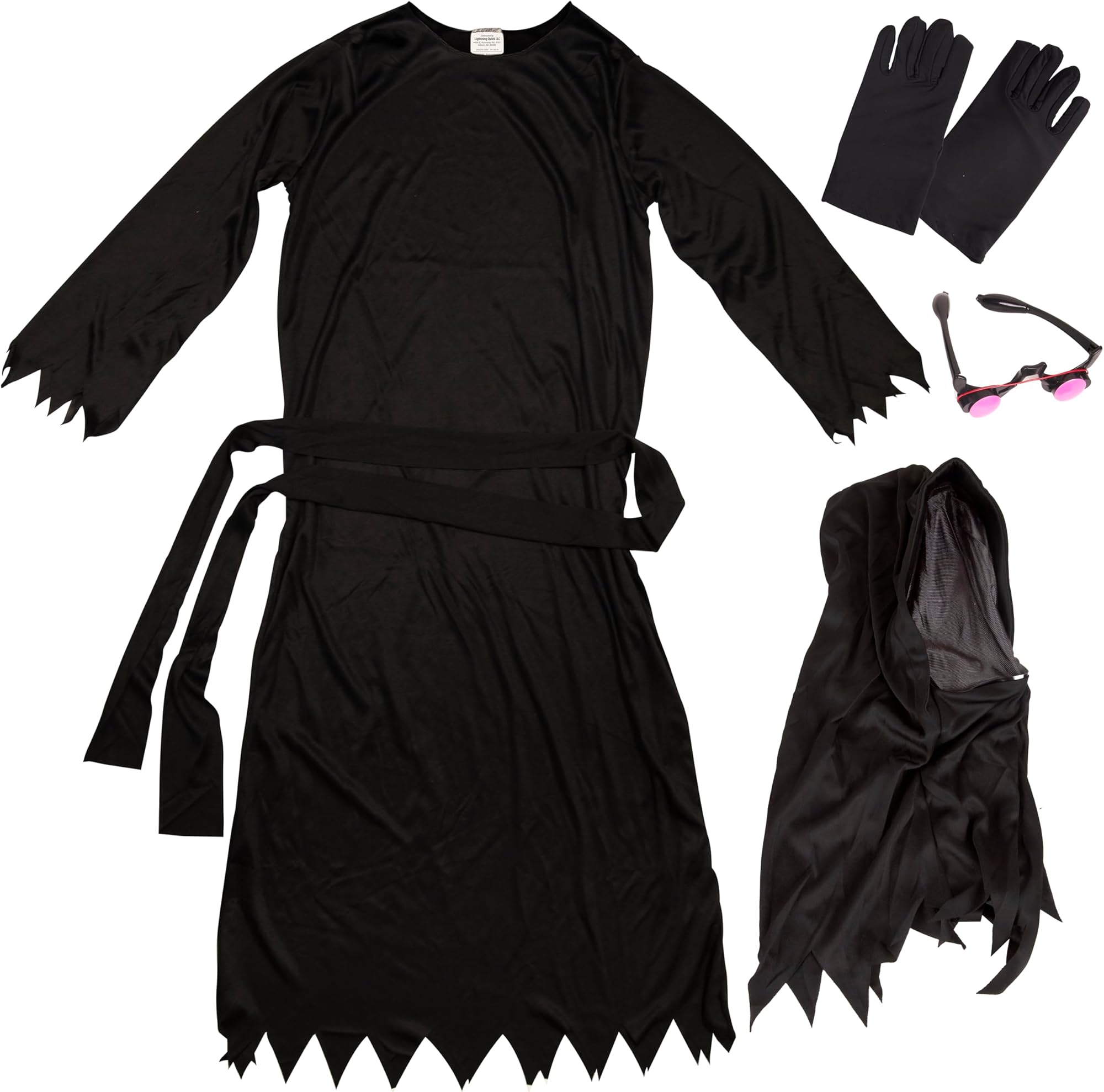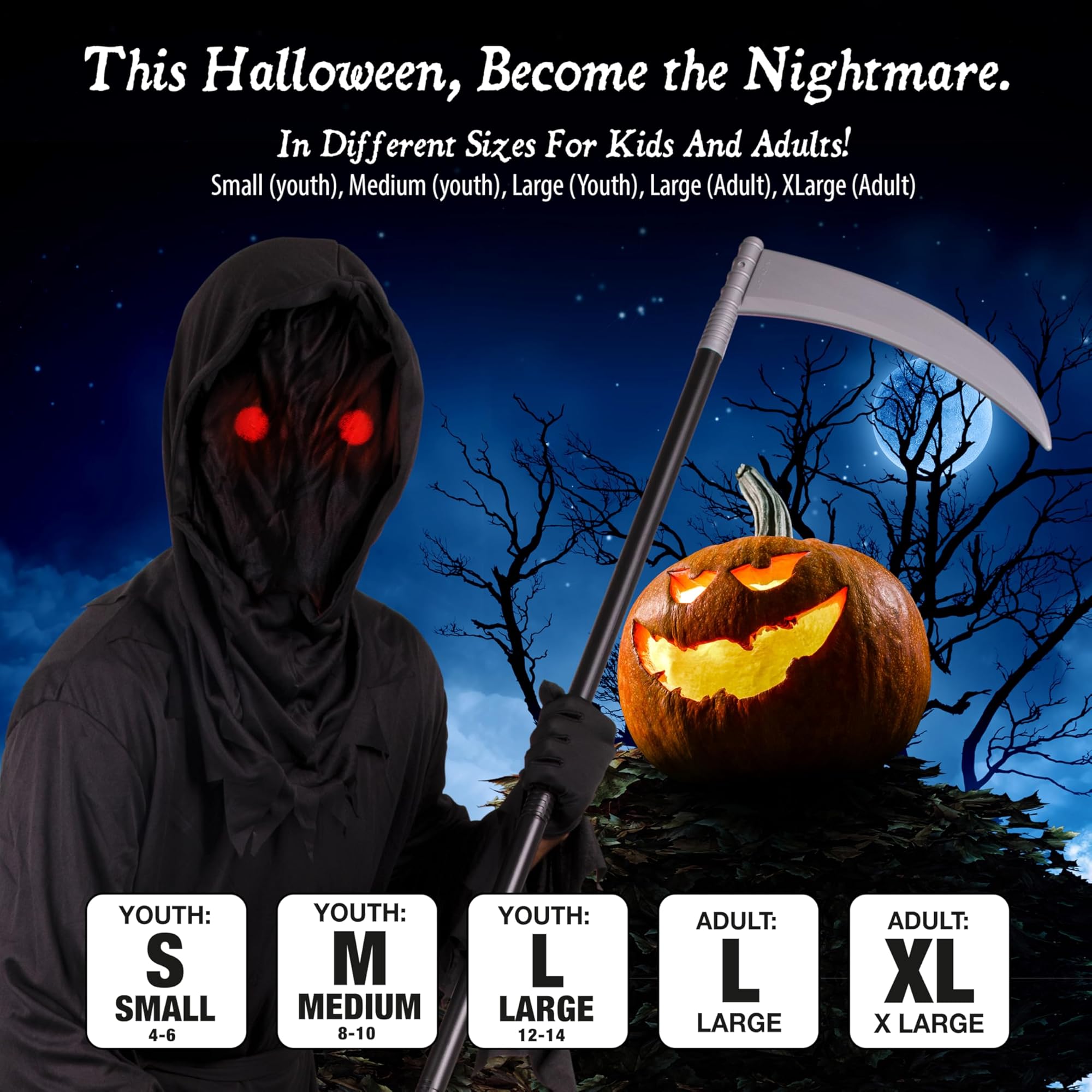- תחפושות ליל כל הקדושים מפחידות למבוגרים מגיעות עם חבילה הכוללת גלימה שחורה, ברדס, חגורה, כפפות, משקפי LED מוארים ודהויים למבוגרים