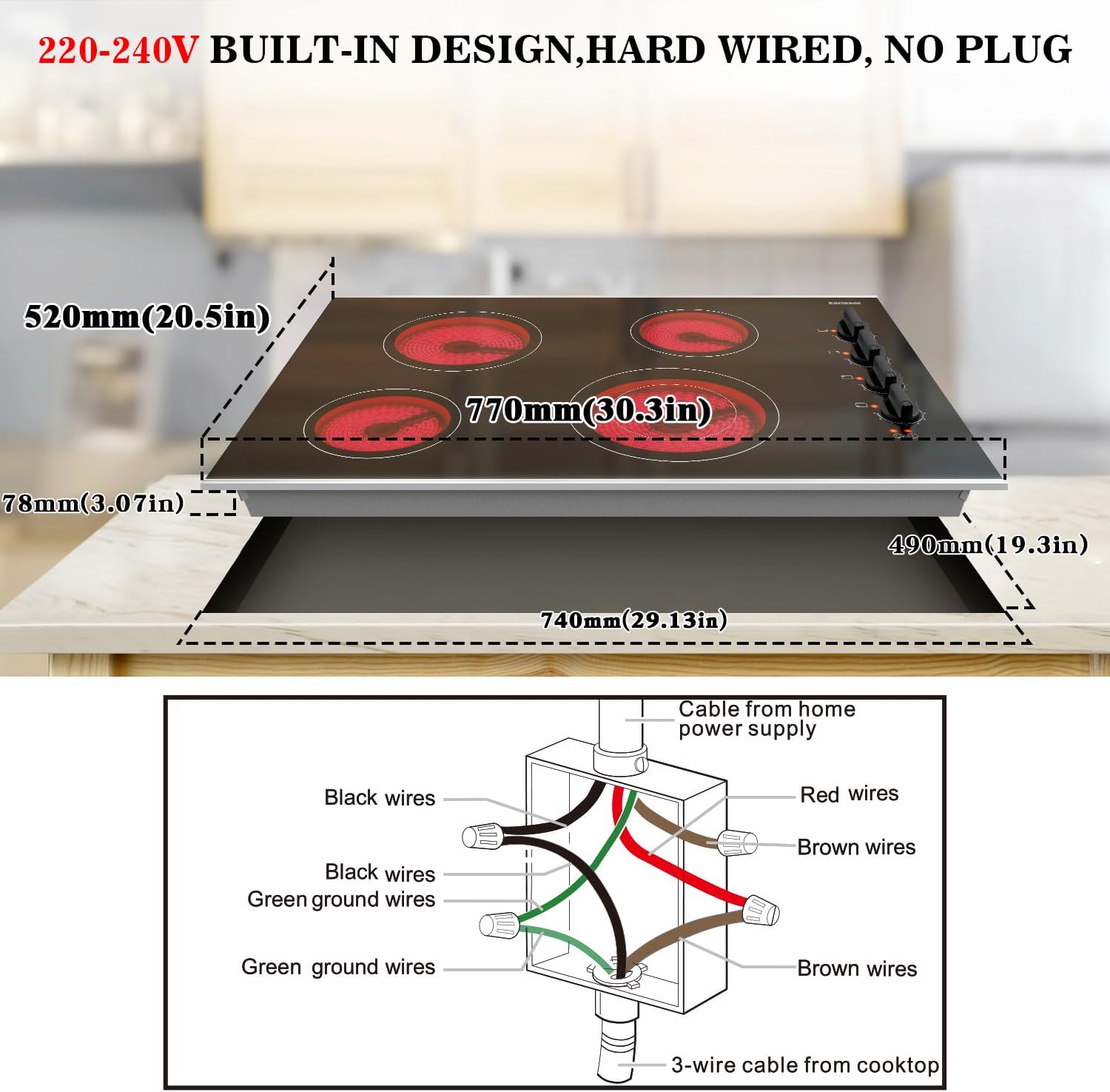- 【9 הגדרות עוצמה וכיריים חשמליות 220v-240v】כיריים קרמיות בגודל 30 אינץ' מצוידות ב-4 מבערים עוצמתיים: 1200W+1200W+1800W+1250/2500W (כפולות). לכל מבער בכיריים החשמליות הנשלפות יש 9 רמות עוצמה, סיבוב הכפתור מאפשר שליטה על העוצמה מ-0-9 רמות, מושלם לבישול, טיגון, טיגון עמוק, הקפצה, צלייה ועוד. כיריים חשמליות מובניות דורשות חיווט מקצועי ל-220-240V, ללא תקע.