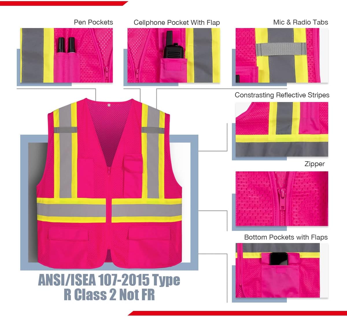 - תאימות ANSI/ISEA: תאימות מלאה לתקני ANSI/ISEA 107-2015 Type R Class 2 (לא FR), מה שמבטיח עמידה בתקנות הבטיחות בעבודה.