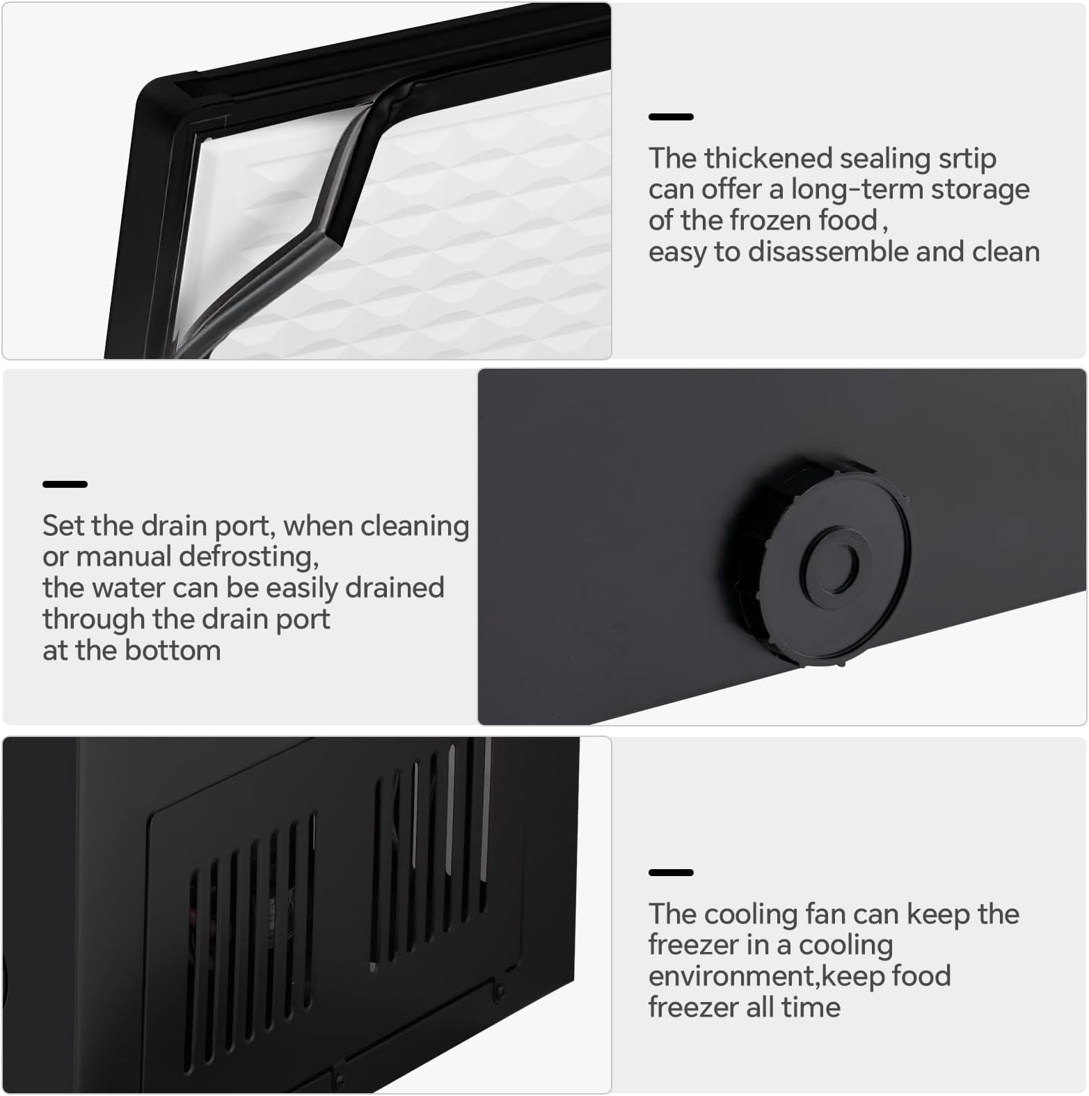 - עיצוב קומפקטי עם קיבולת גדולה: העיצוב החוסך במקום של מקפיא חזה עומד זה בגודל 3.5 רגל מעוקב מודד 21.26 אינץ' * 21.65 אינץ' * 30.91 אינץ'. הקיבולת הגדולה יכולה לשמש למגוון דברים, כולל חלב אם, בשר, פריטים ימיים, משקאות קרים, הקפאה מהירה ועוד. ניתן להשתמש בו בבית, במעונות, במטבח או במשרד.