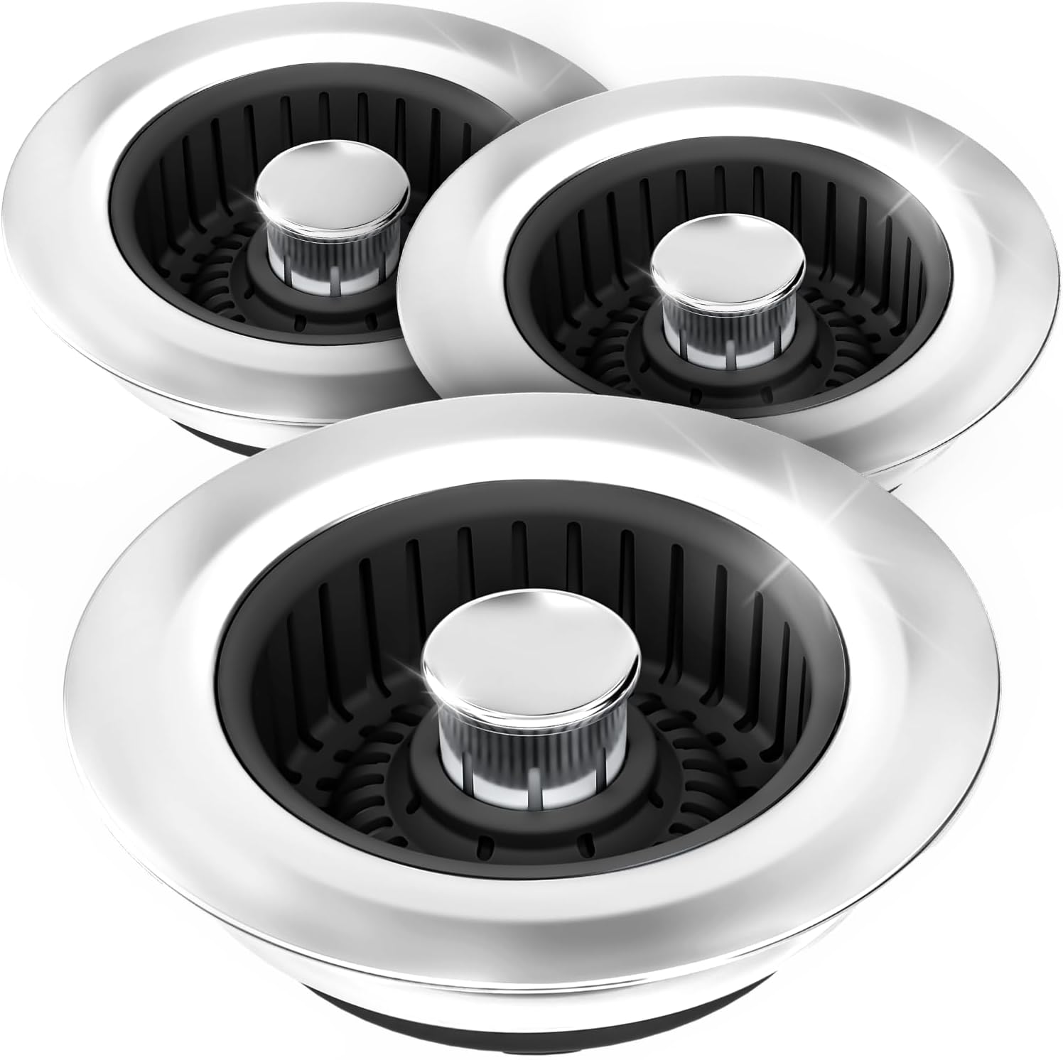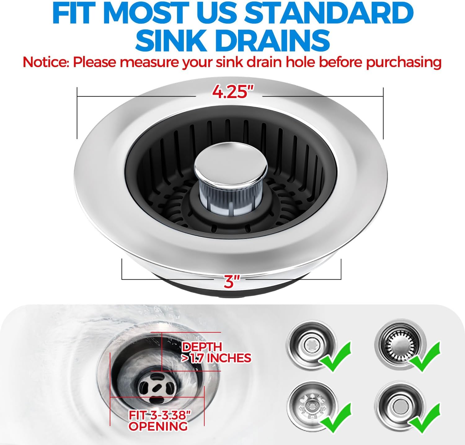 - 【תאימות אוניברסלית לניקוזי כיור סטנדרטיים בארה"ב】 פקק כיור מטבח זה מודד 3 אינץ'-3.38 אינץ', מתאים לרוב חורי הניקוז הסטנדרטיים בארה"ב בקוטר 3-1/2 אינץ'. אנא מדדו את גודל חור הניקוז בכיור שלכם לפני הרכישה.