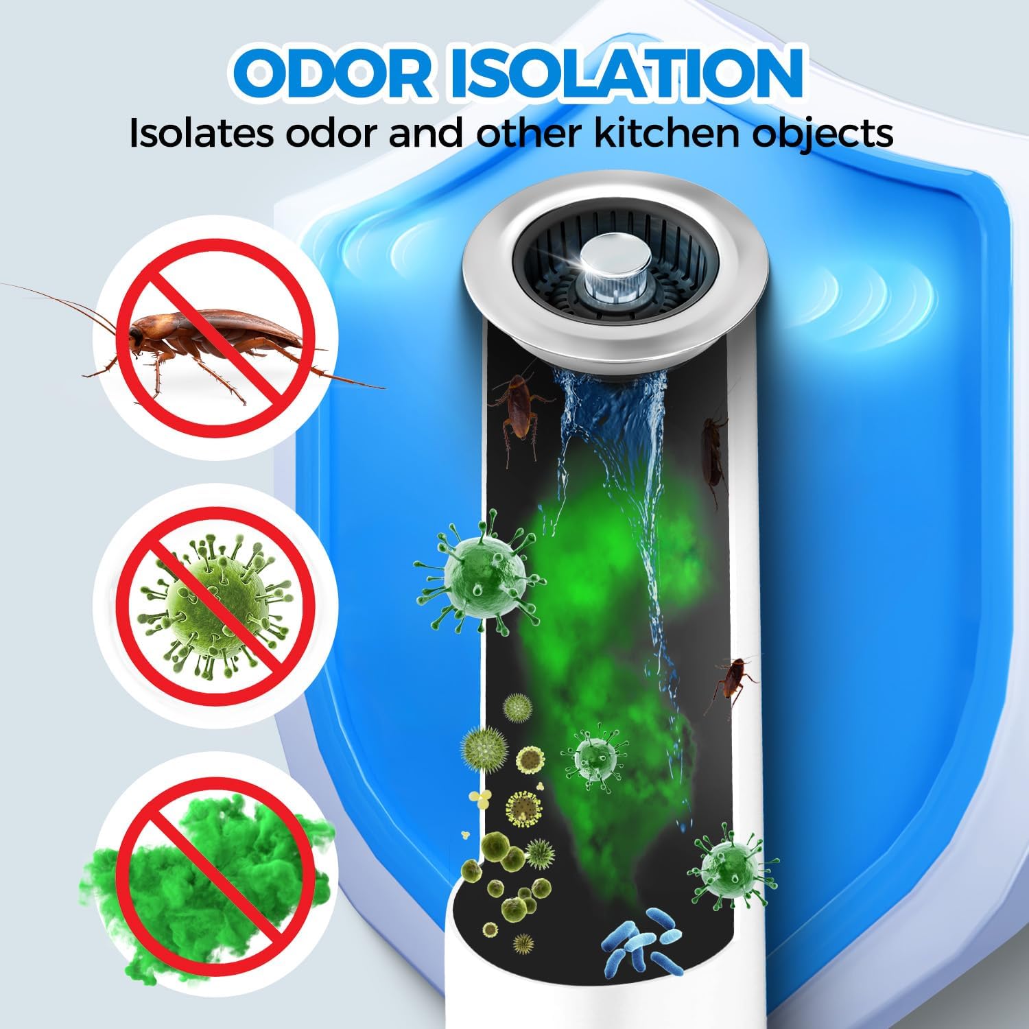- 【מסננת ניקוז משודרגת 3 ב-1 לכיור מטבח】מסננת כיור המטבח שלנו משלבת מסננת ניקוז לכיור, פקק כיור ובידוד ריחות. לחצו על הכפתור הנפתח כדי לאגור מים לשטיפה, לחצו שוב כדי לנקז את המים תוך כדי איסוף שאריות מזון או שאריות שלא יירדו לביוב. עוזר אמין למניעת סתימה וחלקי חובה להתקנת כיור מטבח.