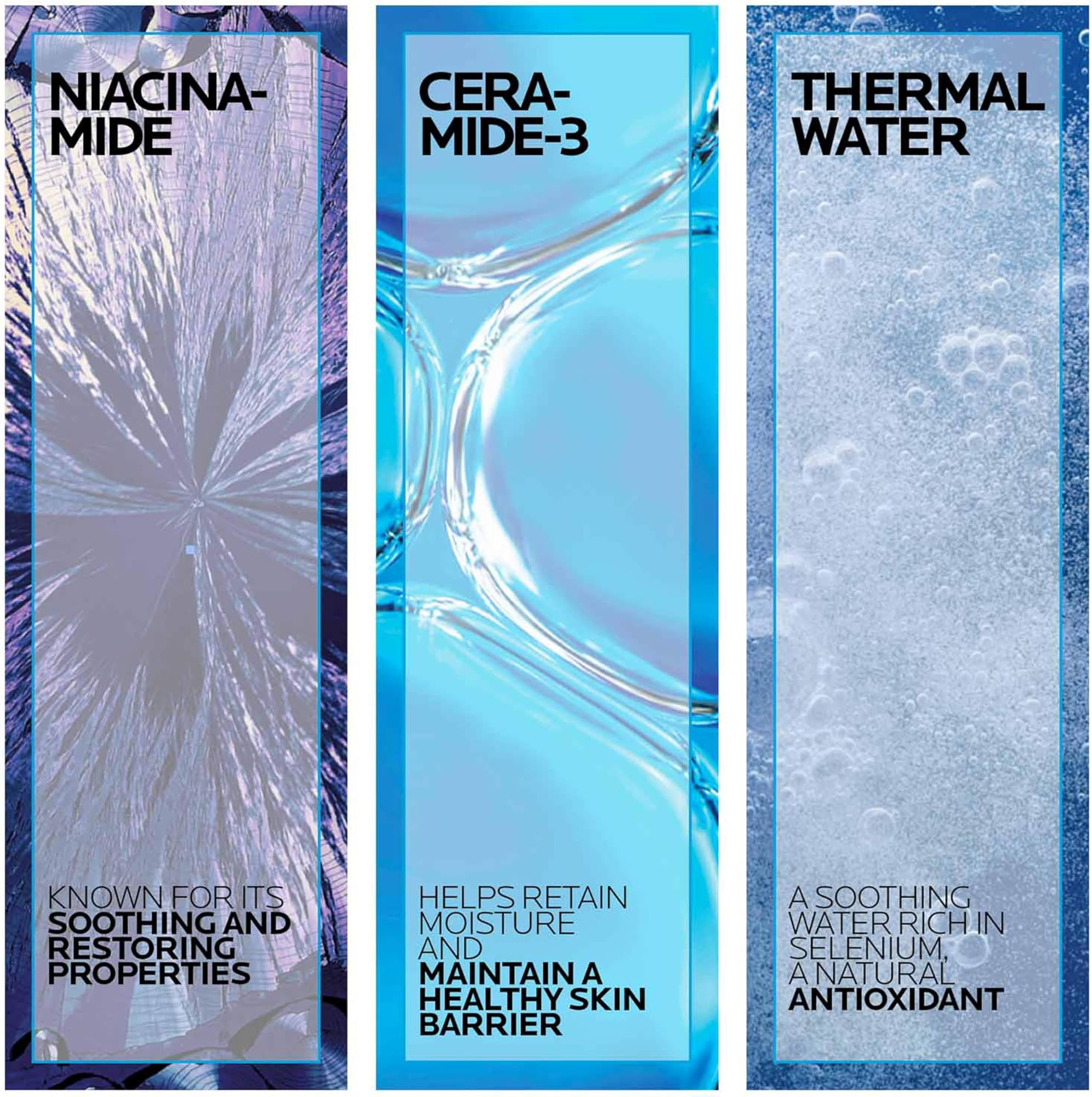 - פורמולה מזינה ללא סבון עם ניאצינמיד: מועשרת במים תרמיים פרה-ביוטיים מרגיעים של לה רוש-פוזה, סרמיד-3 התומך במחסום העור, וניאצינמיד משקם למחסום עור בריא יותר.