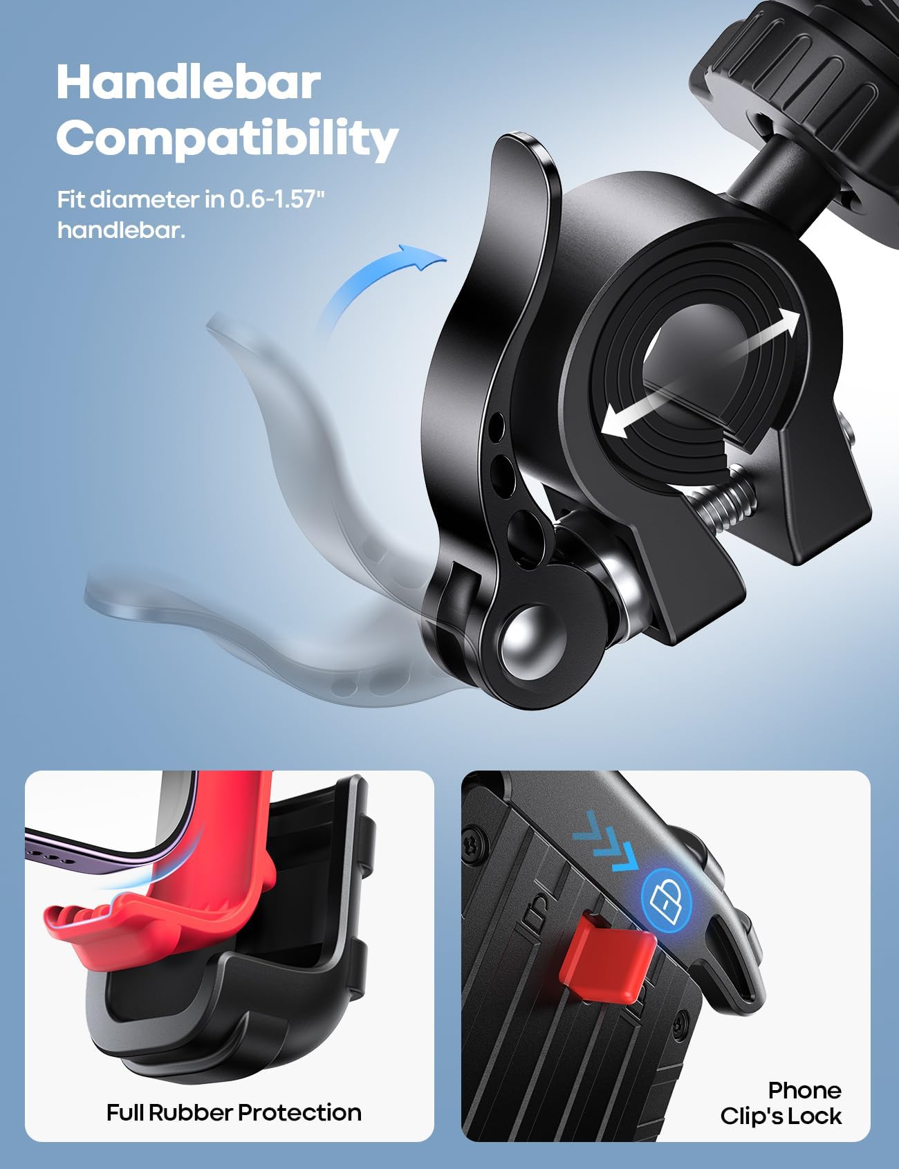 - 【הגנה מפני זעזועים】 תושבת טלפון מתכווננת לאביזרים לאופניים מגיעה עם רפידות סיליקון המונעות משריטות ורעידות על הטלפון. תושבת הטלפון לאופנוע מחזיקה את הטלפון שלך בצורה מושלמת בזמן רכיבה על אופניים.