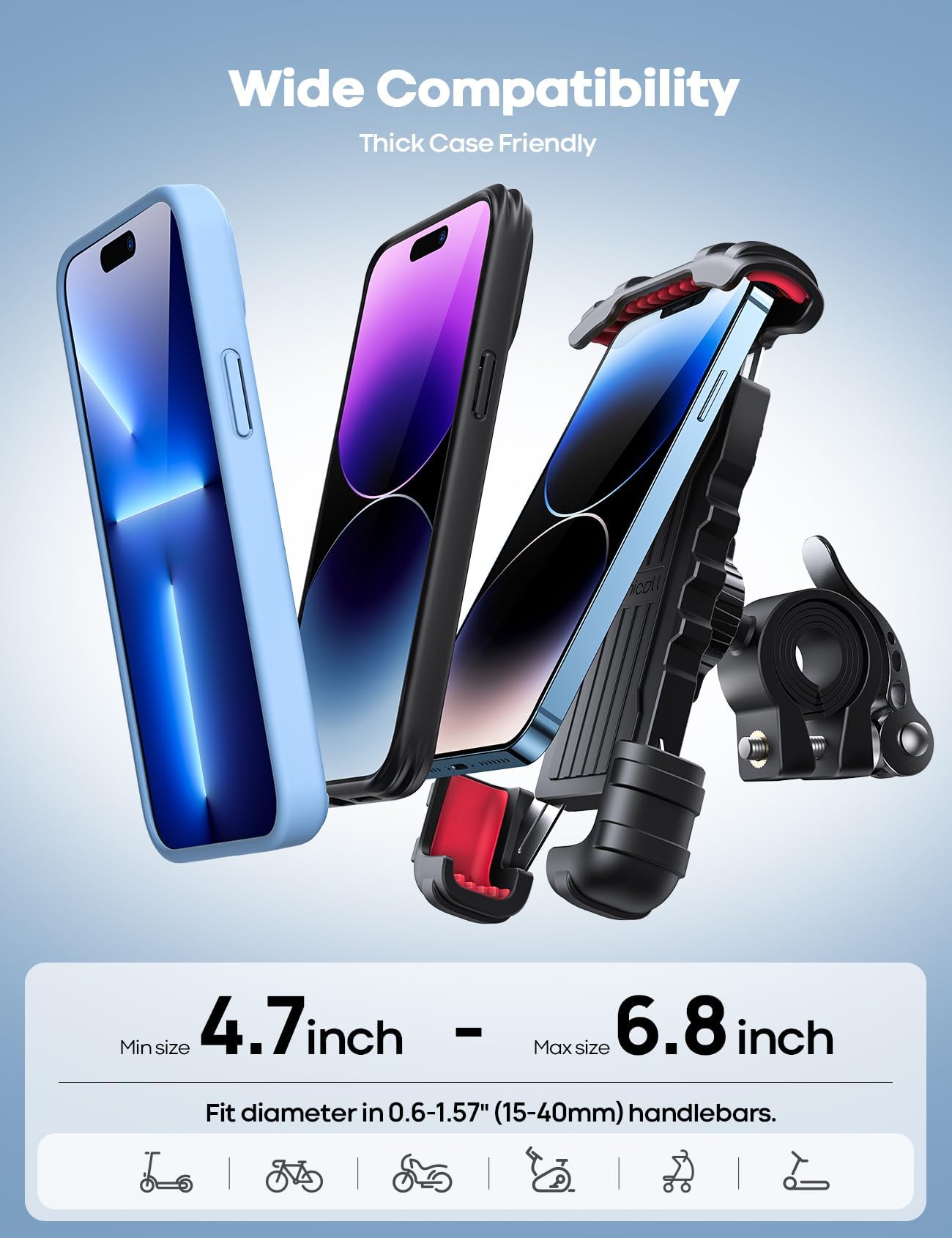 - 【תאימות רחבה】 מחזיק טלפון סלולרי אוניברסלי זה לאביזרי אופניים מתאים לגודל 4.7 ו-6.8 אינץ' בעובי של עד 15 מ"מ (כולל כיסוי לטלפון), כמו אייפון 16, אייפון 16 פלוס, אייפון 16 פרו, אייפון 16 פרו מקס, אייפון 15, אייפון 15 פלוס, אייפון 15 פרו, אייפון 15 פרו מקס, אייפון 14 13 פרו מקס, 12 מיני, Xs XR X 8 פלוס 7 6s 6, גלקסי S10 + S10e S9 S8, נוט 9, LG וטלפונים סלולריים אחרים.