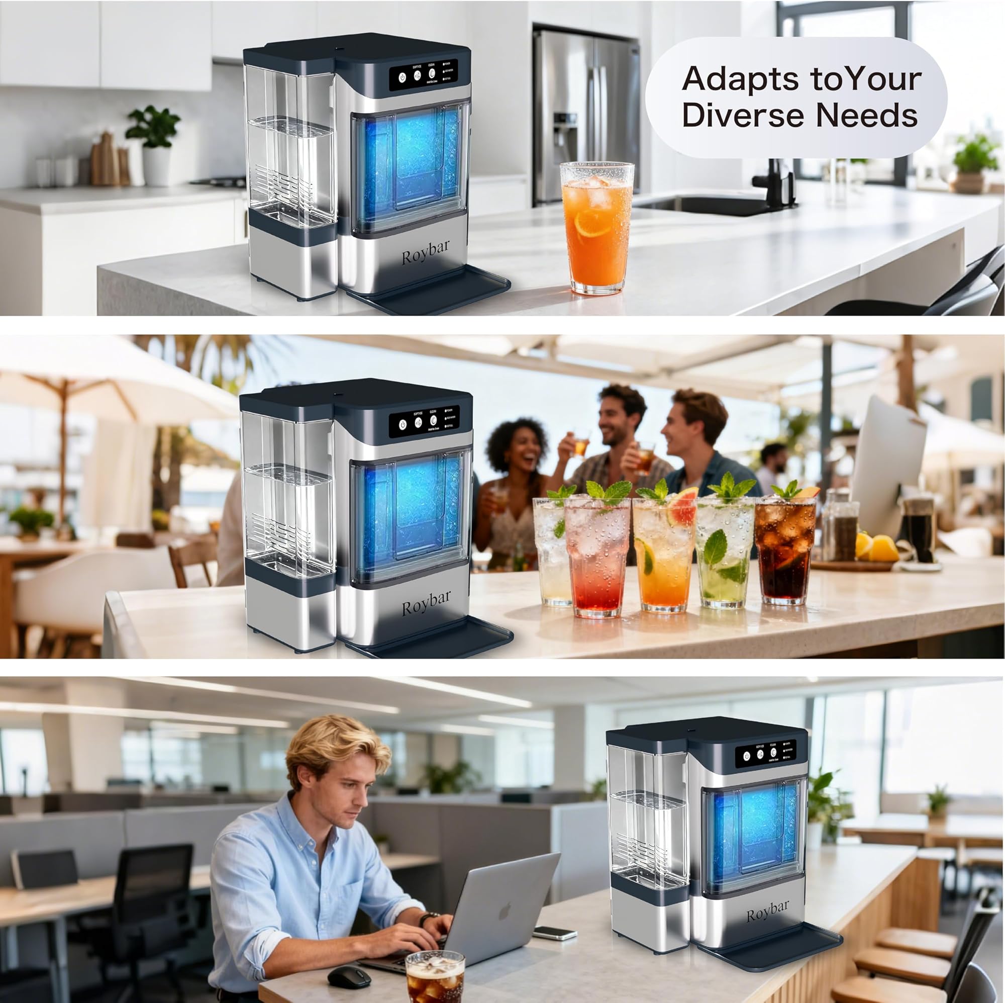 - מכונת קרח ייחודית לקוביות קרח: מכונת הקרח שלנו בולטת ביכולתה לייצר גושי קרח, השונה מקוביות קרח קשות רגילות. היא משתמשת במדחס יעיל ביותר כדי לדחוס במהירות את פתיתי הקרח ליצירת גוש קרח טעים ומרענן. תיהנו מהטעם הטוב ביותר וקירור מהיר יותר של המשקה.