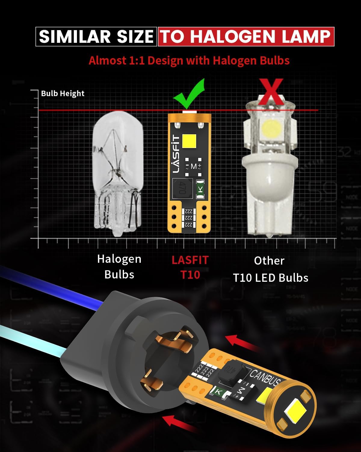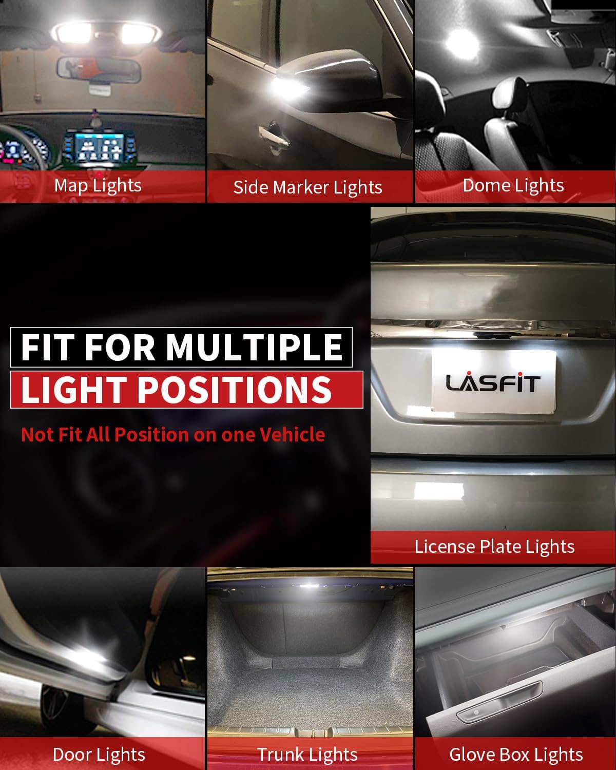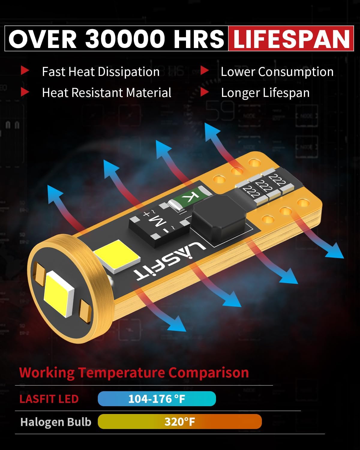 - 【מוכן ל-CAN-BUS】לנורות הלד LASFIT 194/168 יש מערכת CANBUS מובנית, התואמת ל-98% מכלי הרכב, ומונעת קוד שגיאה, הבהוב מוזר והפרעות רדיו. עם זאת, נורות אלו עדיין לא יכולות למנוע מחלק ממכוניות הרכב מרצדס-בנץ, פולקסווגן וג'יפ (כאשר הן מחליפות את פנס לוחית הרישוי ופנס החניה) להראות קוד שגיאה.