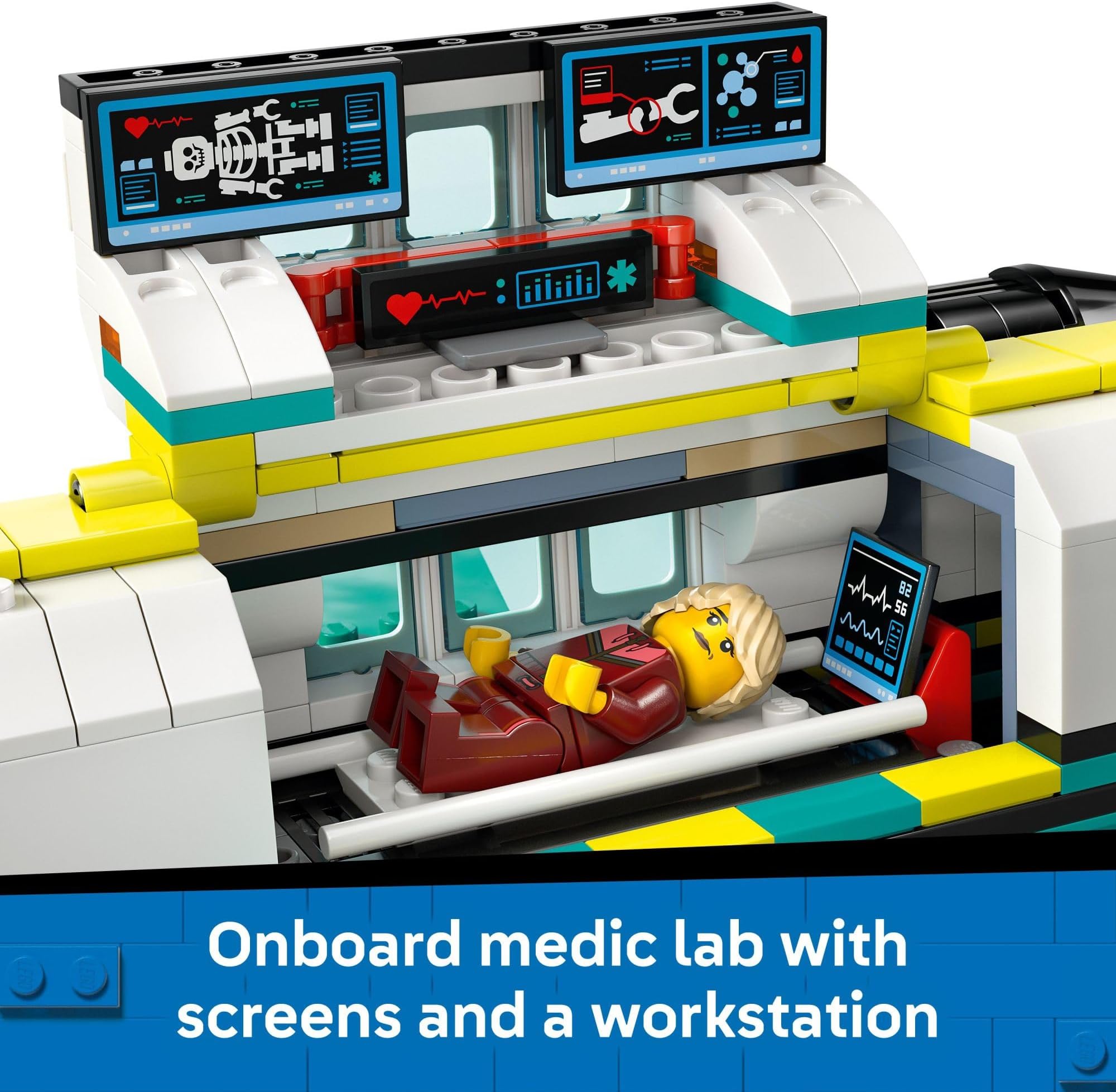 - INTERACTIVE FEATURES – Kids can fold down the boarding stairs to load patients, then access the onboard medical lab complete with monitoring screens, equipment, and treatment stations