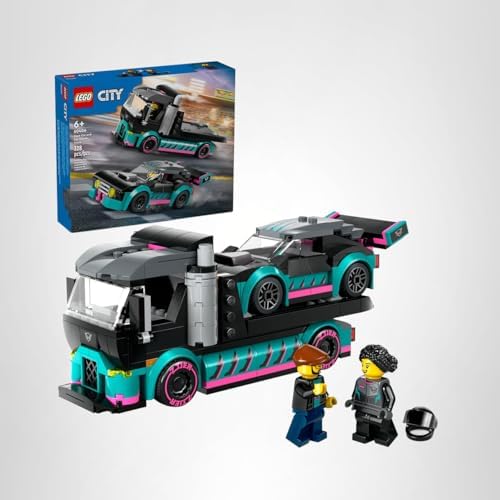 - Toy car transporter – Fans of race cars and trucks can enjoy hours of play with this LEGO City Race Car and Car Carrier Truck toy building set for ages 6 and up