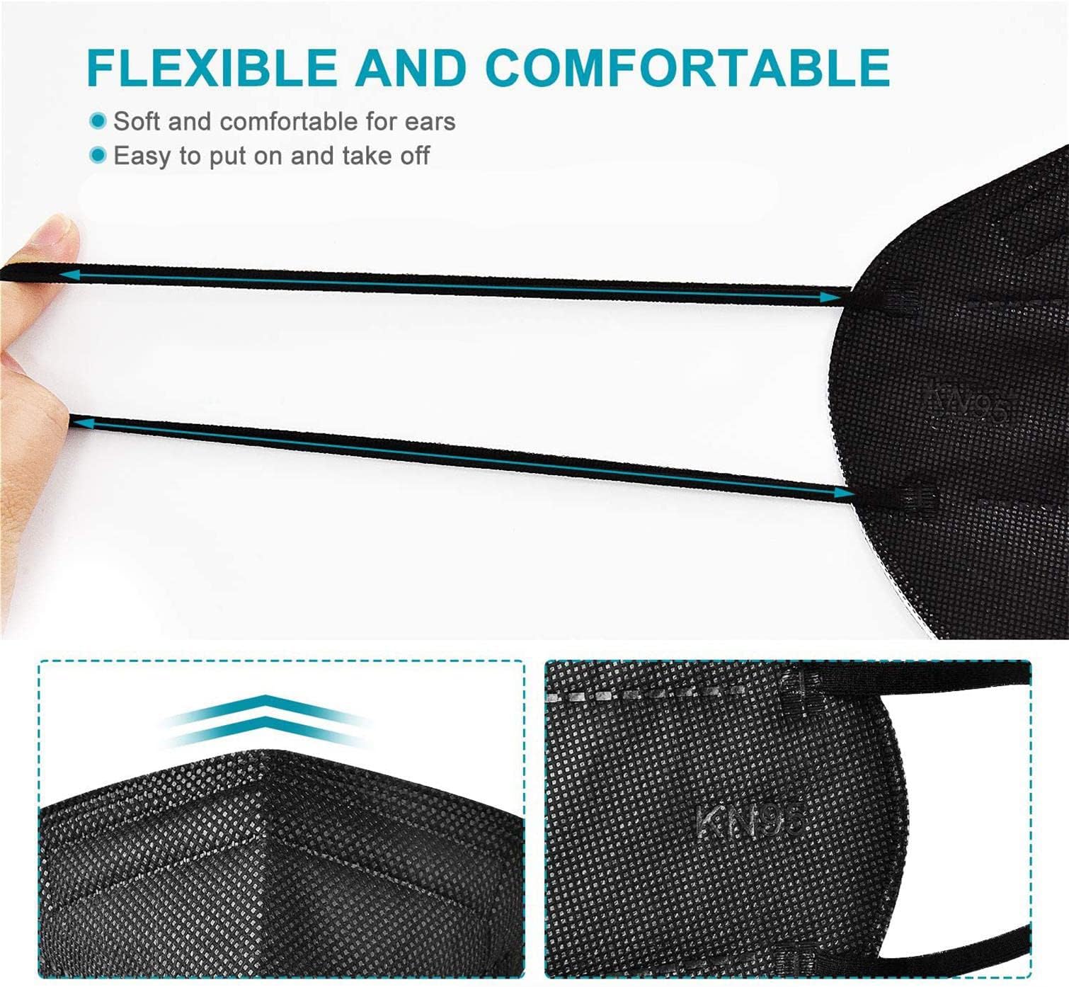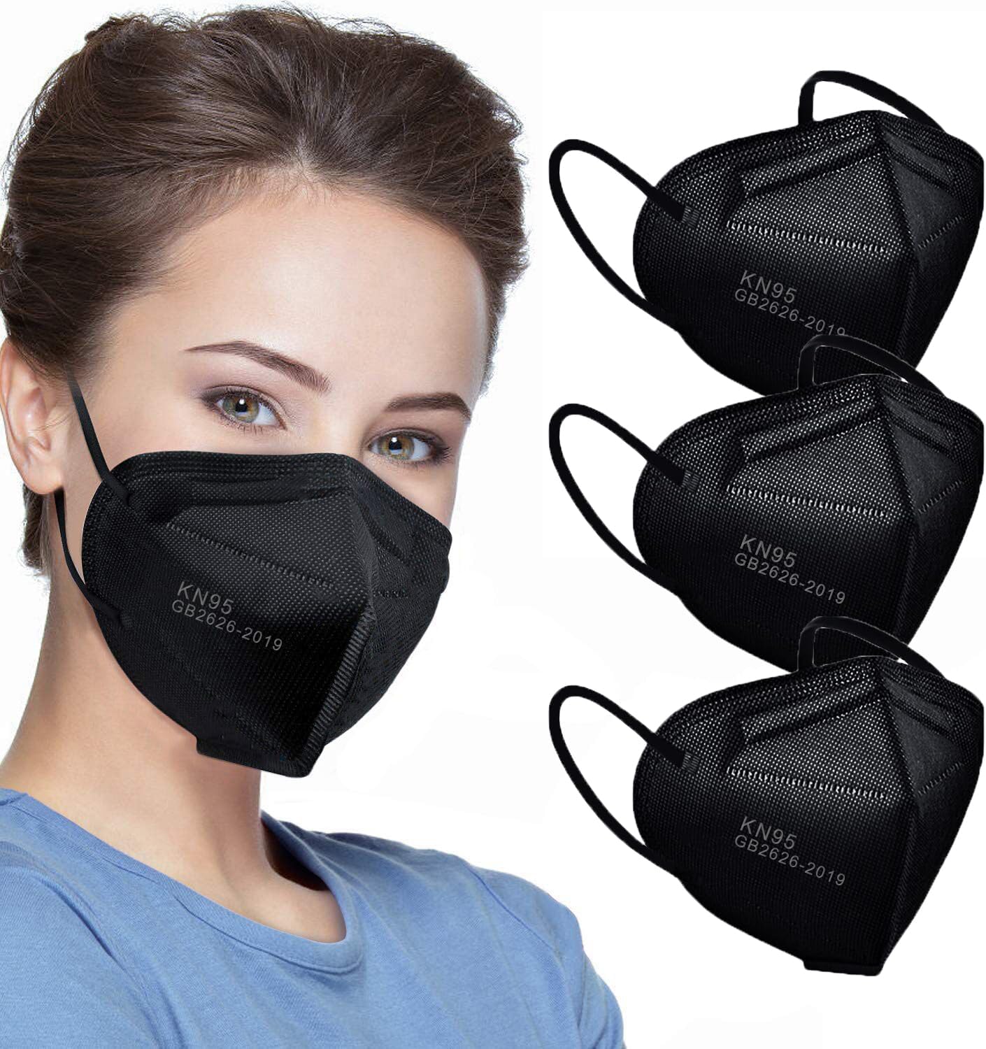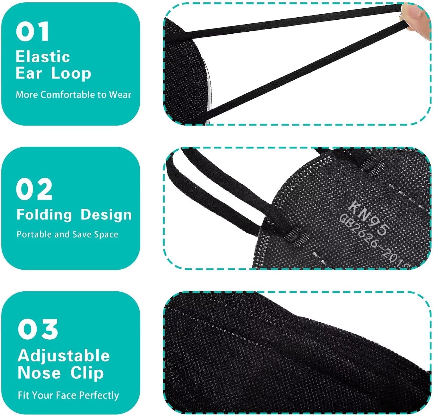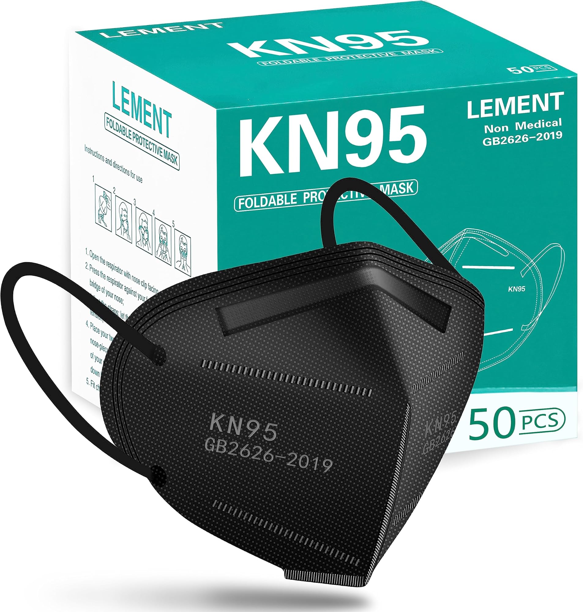 LEMENT 50 יחידות מסכת פנים KN95 שחורה 5 שכבות מסכות בטיחות נגד אבק יעילות סינון ≥95% נושמות לולאות אוזניים אלסטיות מסכות שחורות