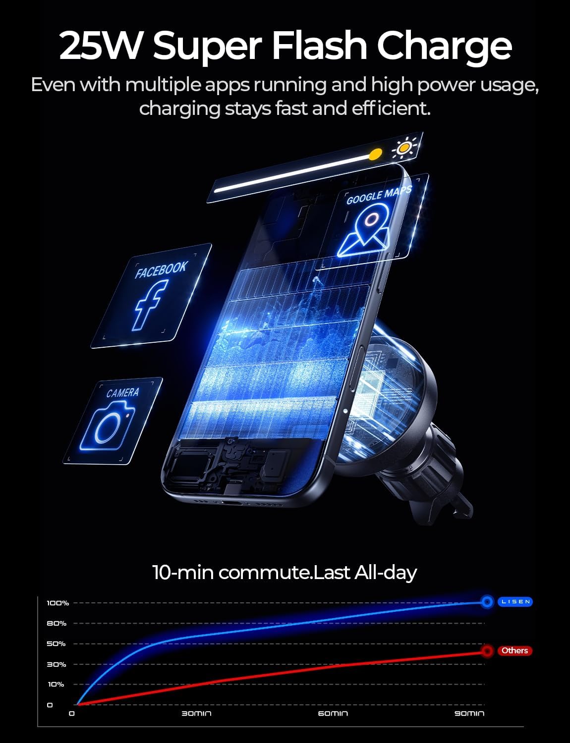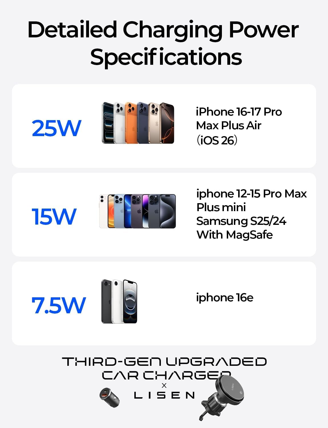 - 10-minute Commute,Last All-day:From 7.5W to 15W to 25W Max, a quantum leap in wireless charging speed deliver.Charge your iPhone 17 Pro from 0 to 30% in 10 minutes. and 30 minutes from 0% to 60% charge.Note:iPhone 17/16 series with iOS26 ,Pixel 10 Pro XL supports 25W charging;iPhone 15/14/13/12 series,Samsung S25 with MagSafe supports 15W charging.iPhone 16e supports 7.5W charging