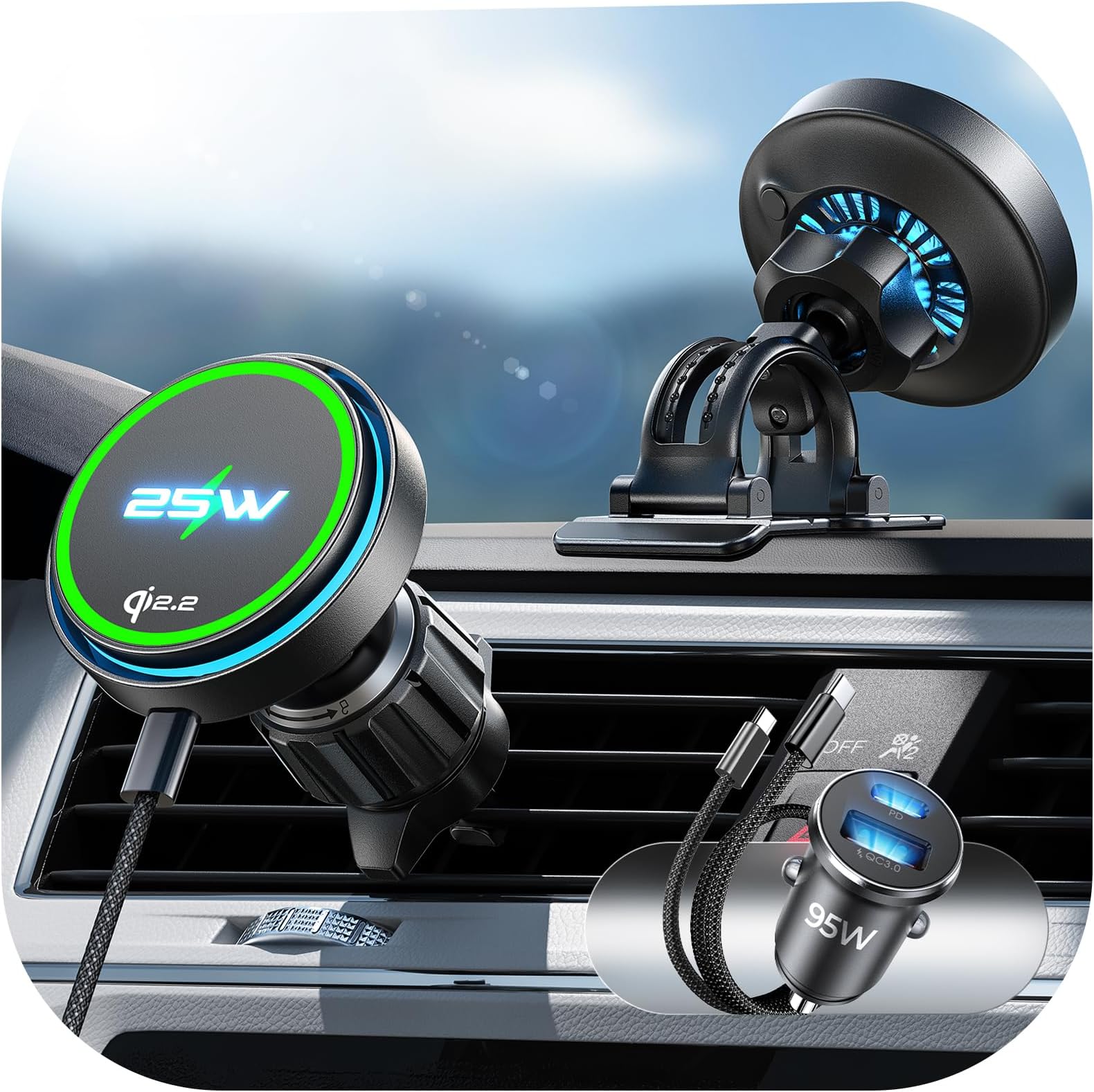 - Complete set of accessories:1.Featuring a dual-port car charger with 95W max independent power output: USB-C port: 65W max USB-A port: 30W max.2.Featuring adjustable G23F 3M adhesive and vent mount options, this car phone holder ensures firm attachment to your dashboard or air vent, remaining stable even on bumpy rides.Support vent blade thickness not more than 4.5mm, depth not more than 28mm 3.Featuring a C to C Braided Nylon Cable