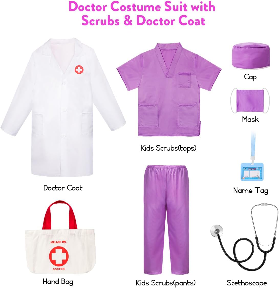 התחפשו לרופא קטן אמיתי עם בגדי רופא וחלוק מעבדה לילדים. תחפושת דוקטור מלנד בצבעים ורוד וירוק לבנים ולבנות מגיל 3 עד 10, ערכת תחפושת שלמה לרופא הכוללת חלוק רופא, חולצה עם בגדי רופא, זוג מכנסי רופא, מסכה כירורגית, כובע, צעצוע סטטוסקופ מדומה, תיק נשיאה נייד לרופא וכרטיס שם.