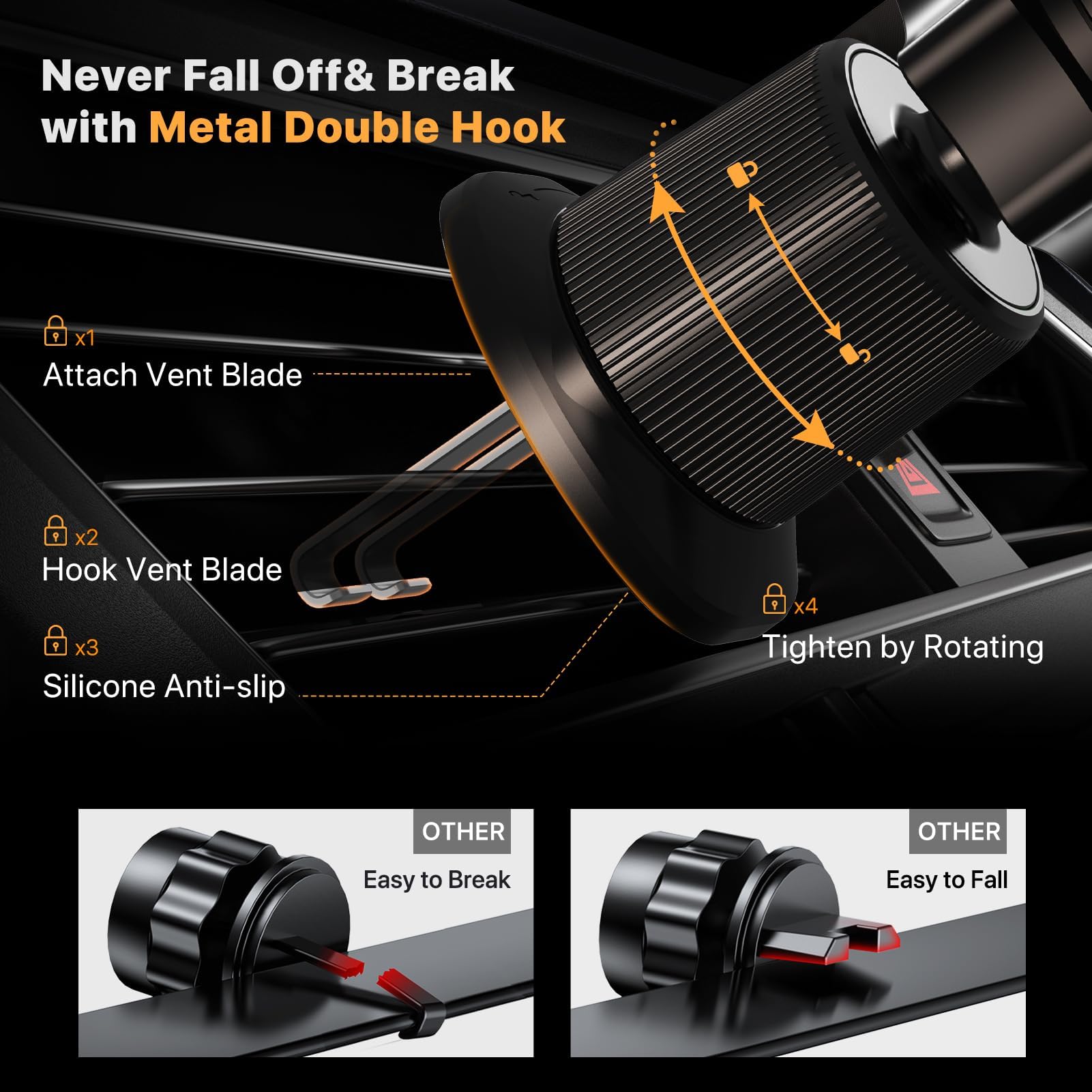 - עיצוב וו מתכתי שלא ייפול לעולם: מחזיק הטלפון לרכב Miracase מאמץ עיצוב נעילה פשוט. וו המתכת הפלדה (עם משטח סיליקון ומשטח) יתפוס את אחד מלהבי פתחי האוורור של הרכב ויספק יציבות מעולה. הוא יעבוד היטב עבור המכונית שלך גם בסביבות קשות במיוחד. הערה: תואם רק לפתחי אוורור אופקיים ואנכיים. לא מתאים לפתחי אוורור עגולים. ניתן להשתמש בו גם על שידת המיטה והשולחן.