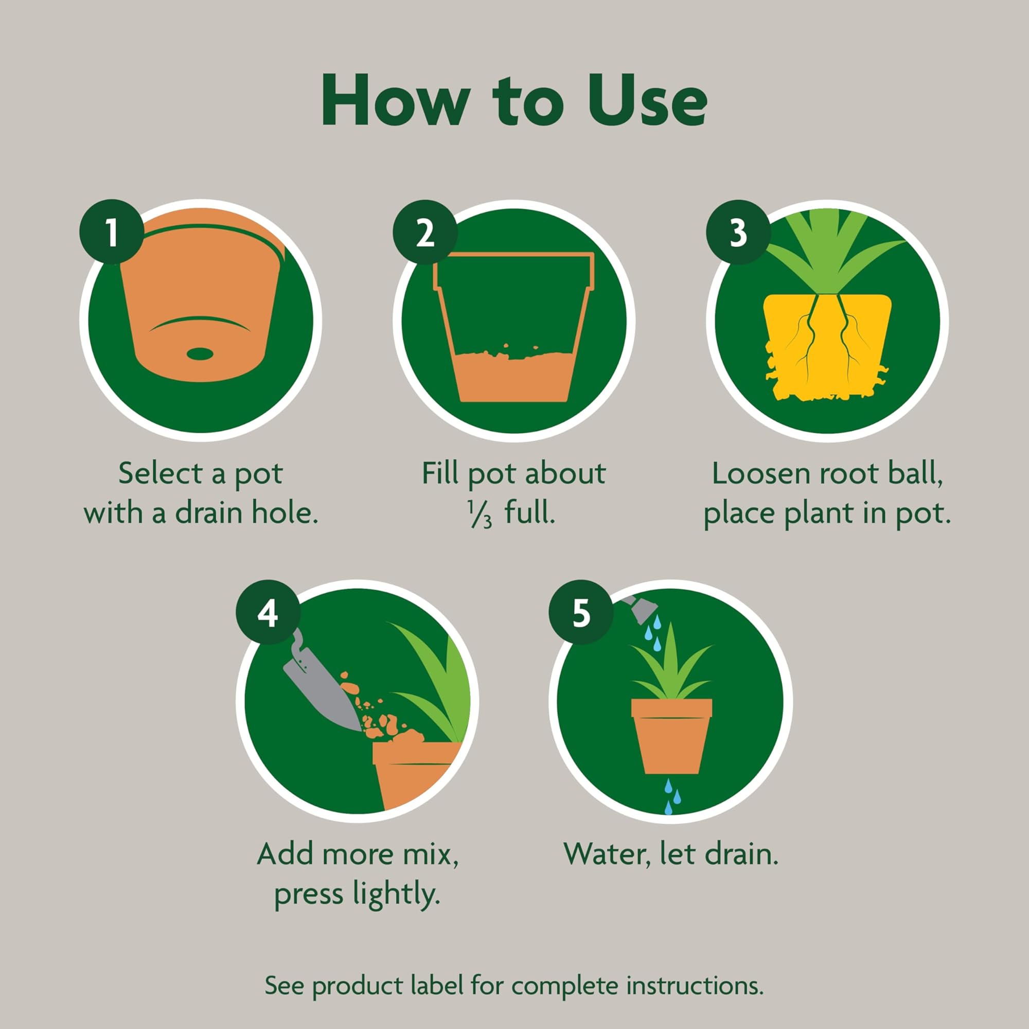 - אופן השימוש: יש למלא מיכל עד כשליש מגובהו בתערובת שתילה; להוסיף תערובת נוספת לאחר הנחת הצמח בעציץ.
