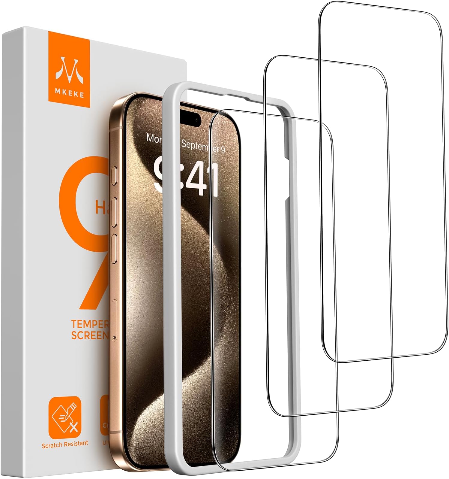 מגן מסך Mkeke לאייפון 15 פרו, חבילה של 3 זכוכית מחוסמת [קשיות 9H] [הגנה מפני נפילות ברמה צבאית] [מגע רגיש] [מסגרת התקנה קלה] [HD Clear] למכשיר 6.1 אינץ'