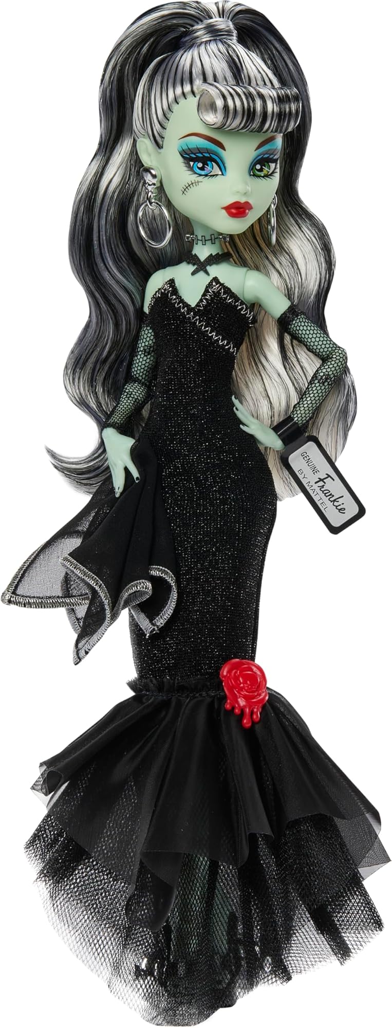 בובת Monster High x Barbie Frankie Stein עם בגד ים מקורי בהשראת ברבי ושמלת ערב שחורה ואביזרים של Solo in The Spotlight