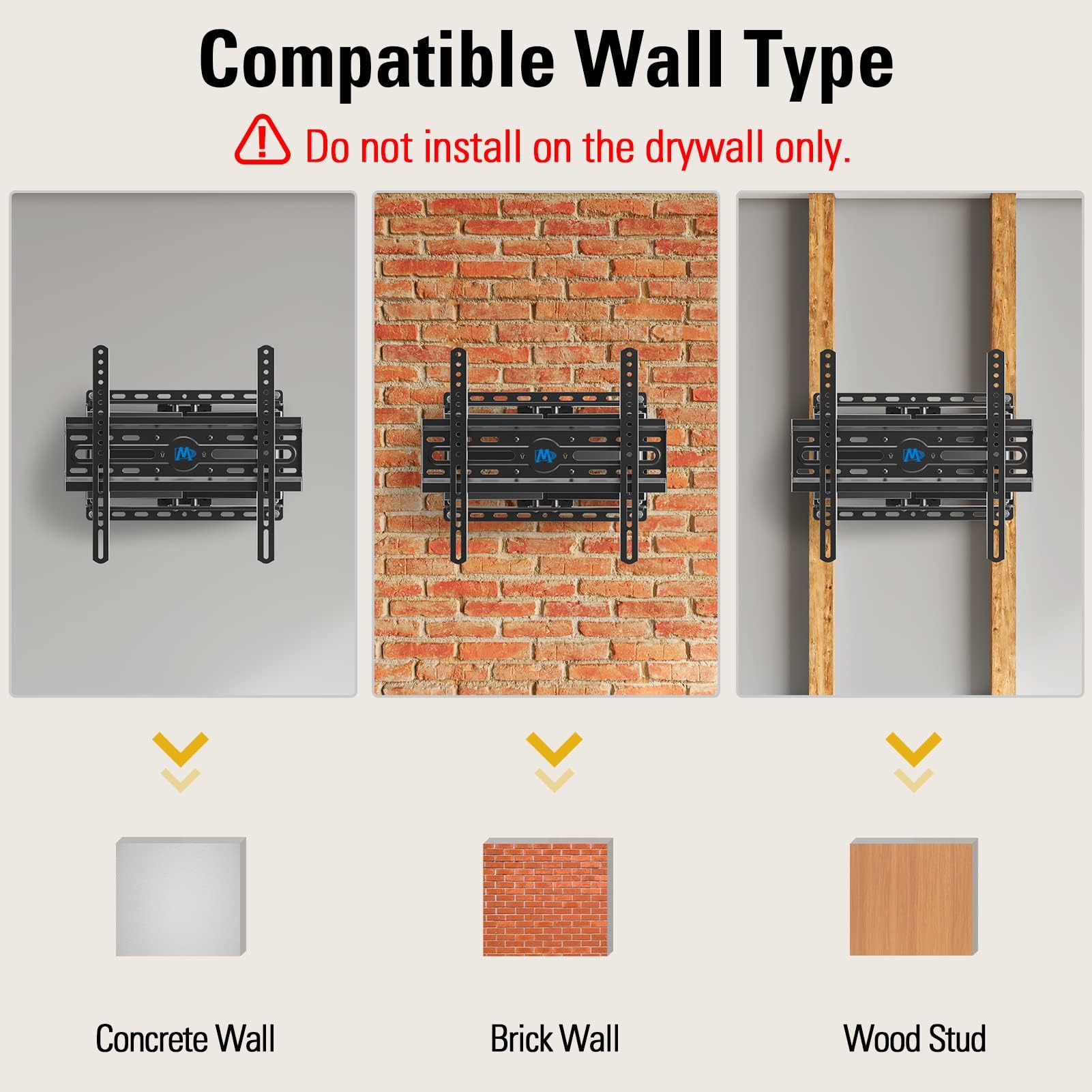 - מתקן טלוויזיה אוניברסלי: מתקן קיר לטלוויזיה מתאים לרוב הטלוויזיות בגודל 32-65 אינץ' עד משקל של 99 פאונד, עם מרווח VESA מקסימלי של 400 מ"מ x 400 מ"מ / 16 אינץ' x 16 אינץ' בין חורי ההרכבה. אם המרווח בין קורות העץ שלכם עולה על 16 אינץ', אנא עיינו במתקן הטלוויזיה MD2380-24K עם תנועה מלאה לקורות עץ בגודל 16 אינץ', 18 אינץ' ו-24 אינץ'.