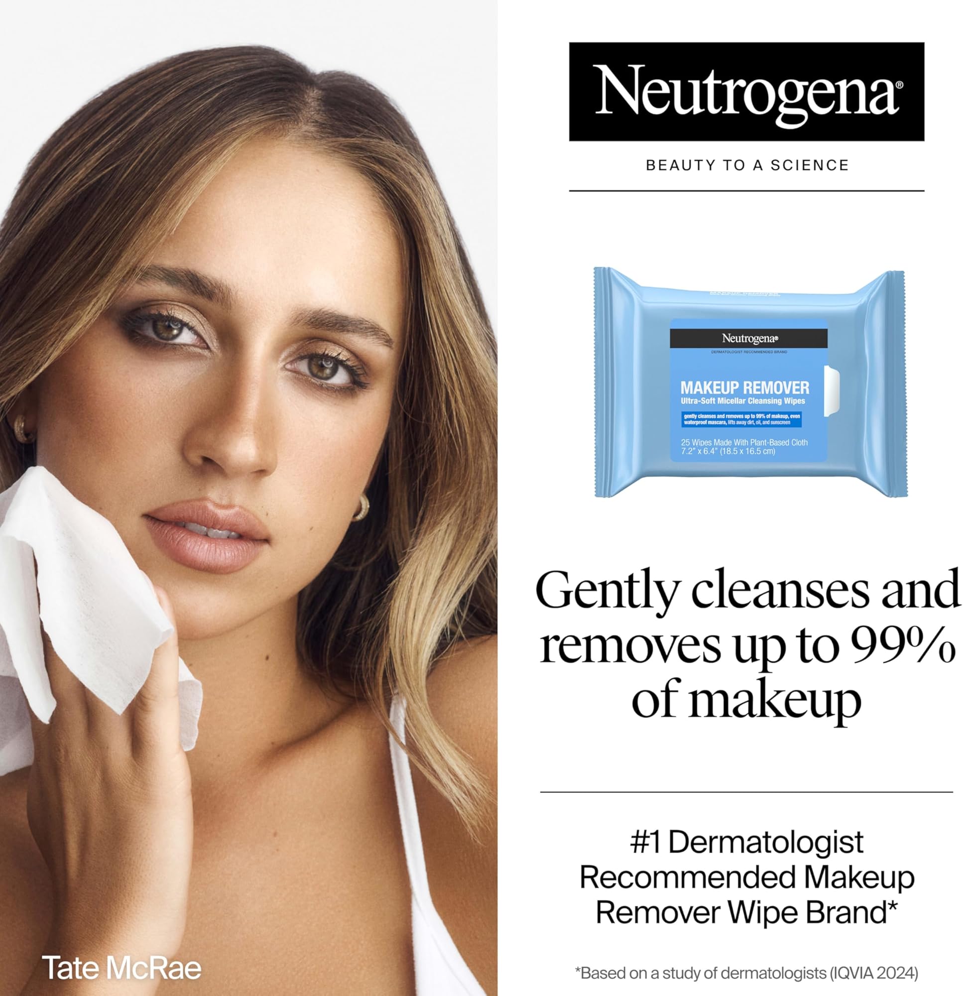 מגבונים להסרת איפור של ניוטרוג'ינה, ללא אלכוהול, מסירים מסקרה ושמן עמידים למים, מטלית מתכלה 100% על בסיס צמחי, נבדקו על ידי דרמטולוגים ורופאי עיניים, אריזה זוגית, 2 x 25 יחידות