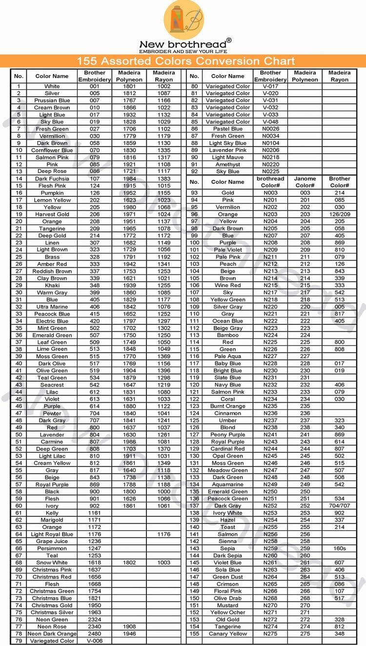- ★★ המרת צבעים זמינה. ניתן להמיר את רוב הצבעים הללו בין צבעי Brother לצבעי Madeira, ותוכלו לקבל את הצבעים הנכונים לפרויקטי הרקמה שלכם בהתאם לטבלת הצבעים החדשה שלנו של Brother בתמונות מס' 3 ו-4.