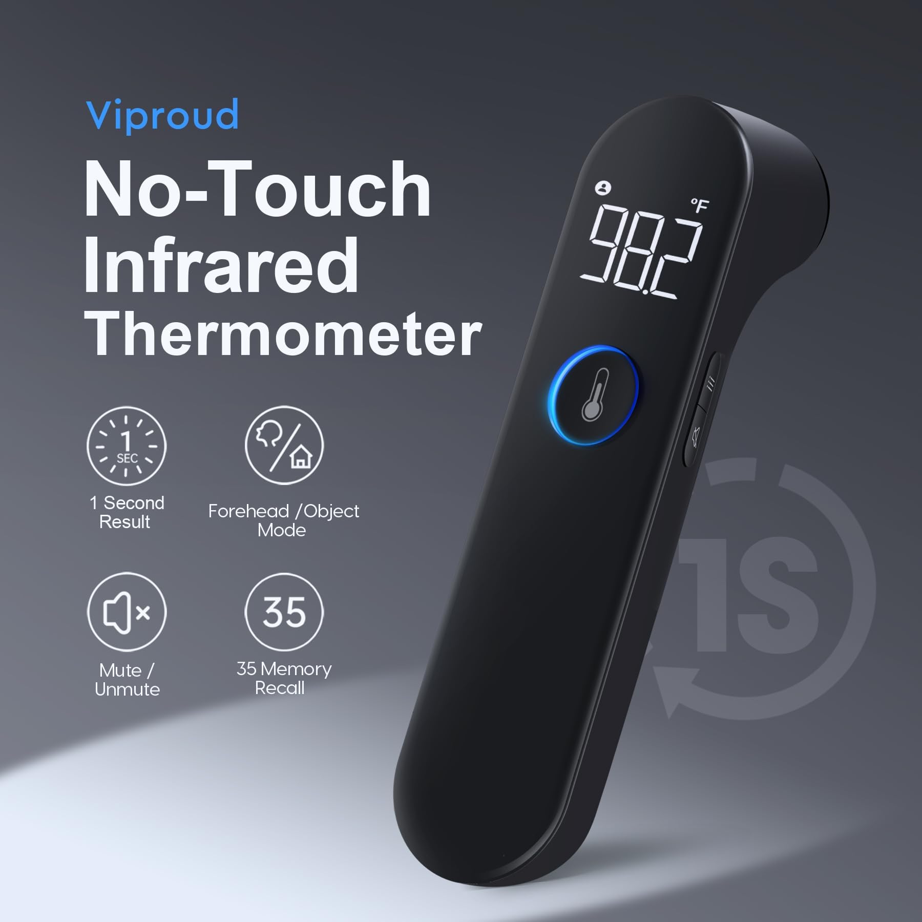 - פונקציות מרובות: מדחום אינפרא אדום Viproud כולל פונקציית מצח ואובייקט דו-מצביים שיכולים למדוד את טמפרטורת המצח, החדר והמזון; 35 סטים של אחסון זיכרון; השתקה בנגיעה אחת; ניתן להחלפה בין ℉/℃; פונקציית כיבוי אוטומטי של 30 שניות, המיועדת לכל המשפחה.