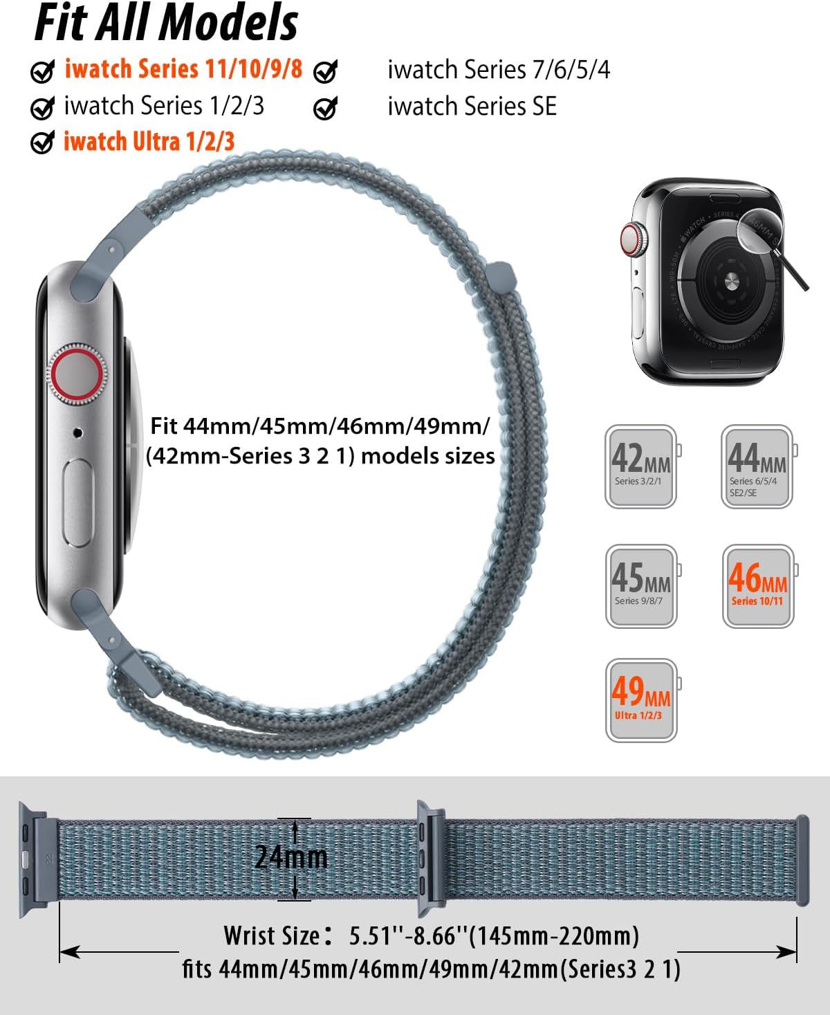 - [מתאים לכל הדגמים]: רצועות שעון ניילון ספורטיביות של Sunnywoo - תואמות לשעון אפל לנשים וגברים, מתאימות לכל שעוני אפל, רצועות iWatch עבור Se, Ultra 3/2/1, סדרה 11, סדרה 10, סדרה 9, סדרה 8, סדרה 7, סדרה 6, סדרה 5, סדרה 4, סדרה 3, סדרה 2, סדרה 1, רצועות פרק כף היד של iWatch מציעות שתי אפשרויות גדלים, ① 5.11"–7.87" (130–200 מ"מ) מתאים למארזים בגודל 38/40/41/42 מ"מ ② 5.51"–8.66" (145–220 מ"מ) מתאים למארזים בגודל 44/45/46/49 מ"מ. אנא בדקו את הגודל בגב השעון ובחרו את הגודל הנכון.