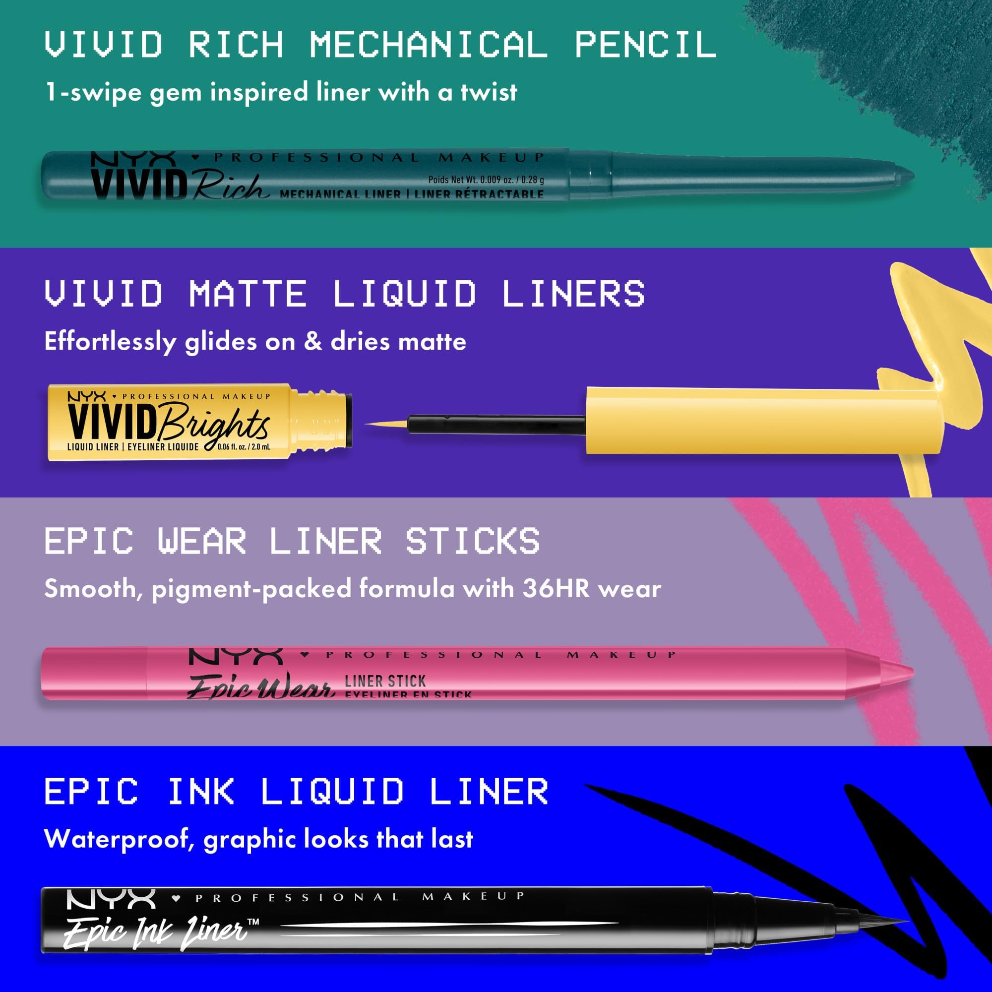 - צרו מראה אייליינר עשיר: סוף סוף נפתחה כספת עיפרון העיניים המכני Vivid Rich! רכשו את גווני האייליינר העשירים ביותר של מאט, מנצנץ ומטאליות! מפנינה חריפה ועד ענבר יפהפה, אייליינרים חדים כתער ייצרו את מראה העיניים העשיר ביותר אי פעם.