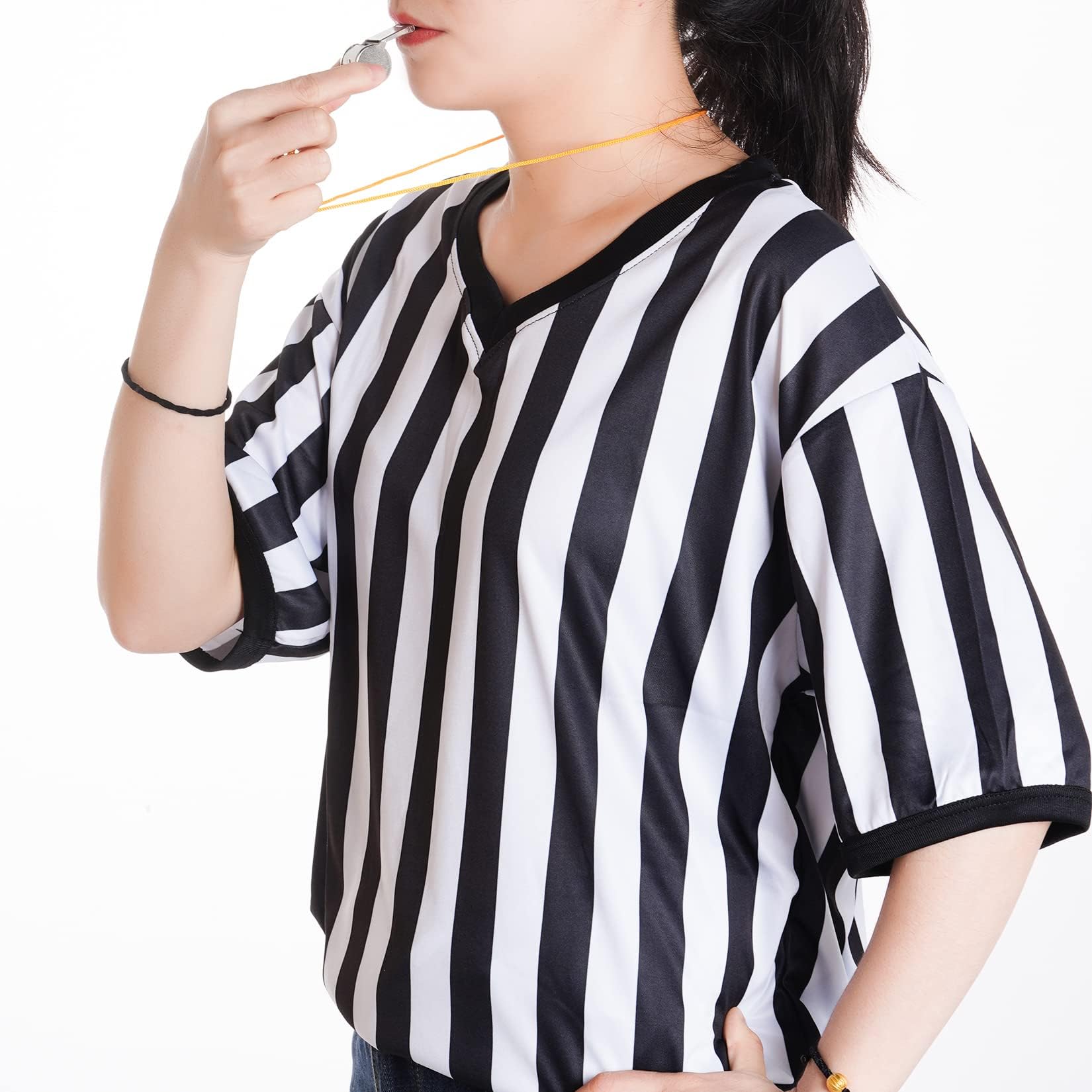 - תלבושת חולצת שופט: תקבלו חלק אחד של חולצת שופט עם פסים שחורים ולבנים, חלק אחד של משרוקית מפלדת אל-חלד עם שרוך וחלק אחד של דגל עונשין צהוב, סט שלם לשופטי ספורט.