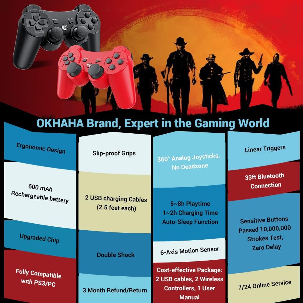 חבילה של 2 בקרי אוקההה ל-PS3 בקר אלחוטי לסוני פלייסטיישן 3, Double Shock 3, בלוטות', נטען, חיישן תנועה, שלט רחוק ל-PS3 (ללא פסים (שחור + אדום))