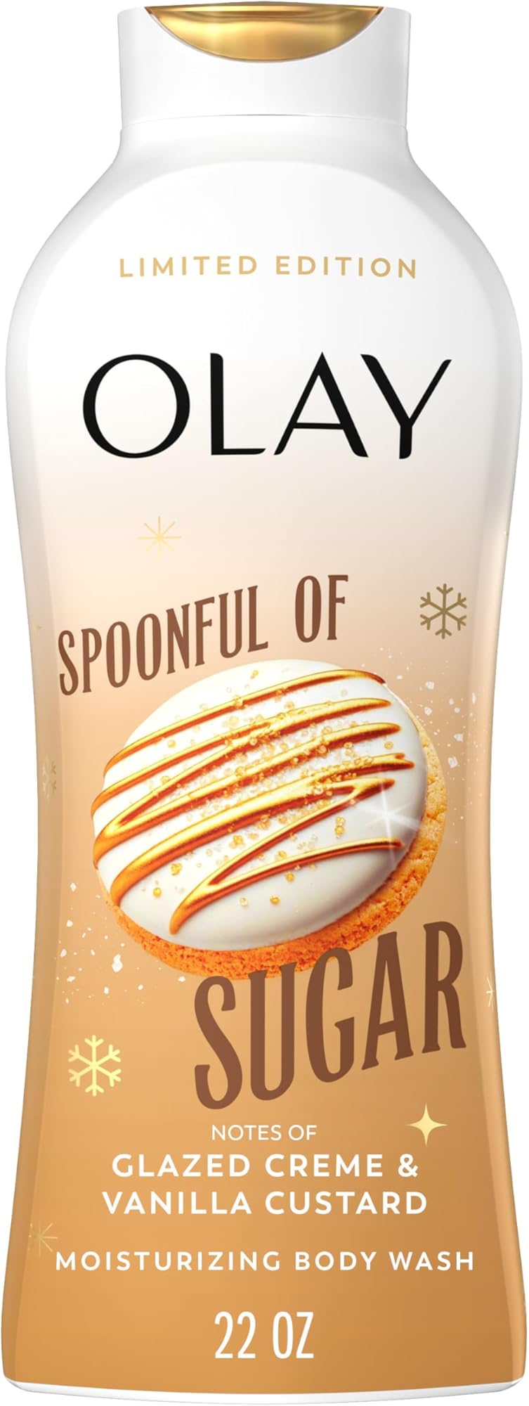 סבון גוף Olay לנשים, לחות ומלחחות, מהדורת חג, עם חומרי ניקוי על בסיס צמחי, קומפלקס B3, לכל סוגי העור, כף סוכר עם ניחוח קרם מזוגג וקצפת וניל, 22 אונקיות נוזל