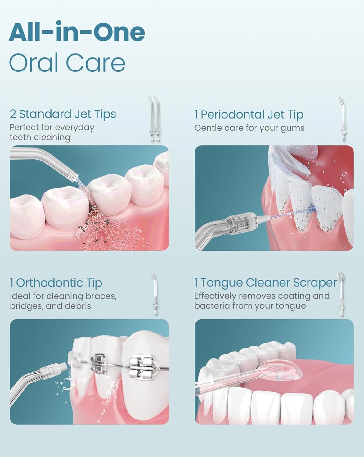 - מיכל מים גדול משודרג של 300 מ"ל ללא BPA, פחות צורך במילוי חוזר: חוט דנטלי המים שלנו כולל כעת מיכל מים גדול יותר של 300 מ"ל, כפול מהקיבולת של דגמים ישנים יותר. עם פחות צורך במילוי חוזר, הוא הופך את ניקוי הפה לנוח ויעיל יותר.