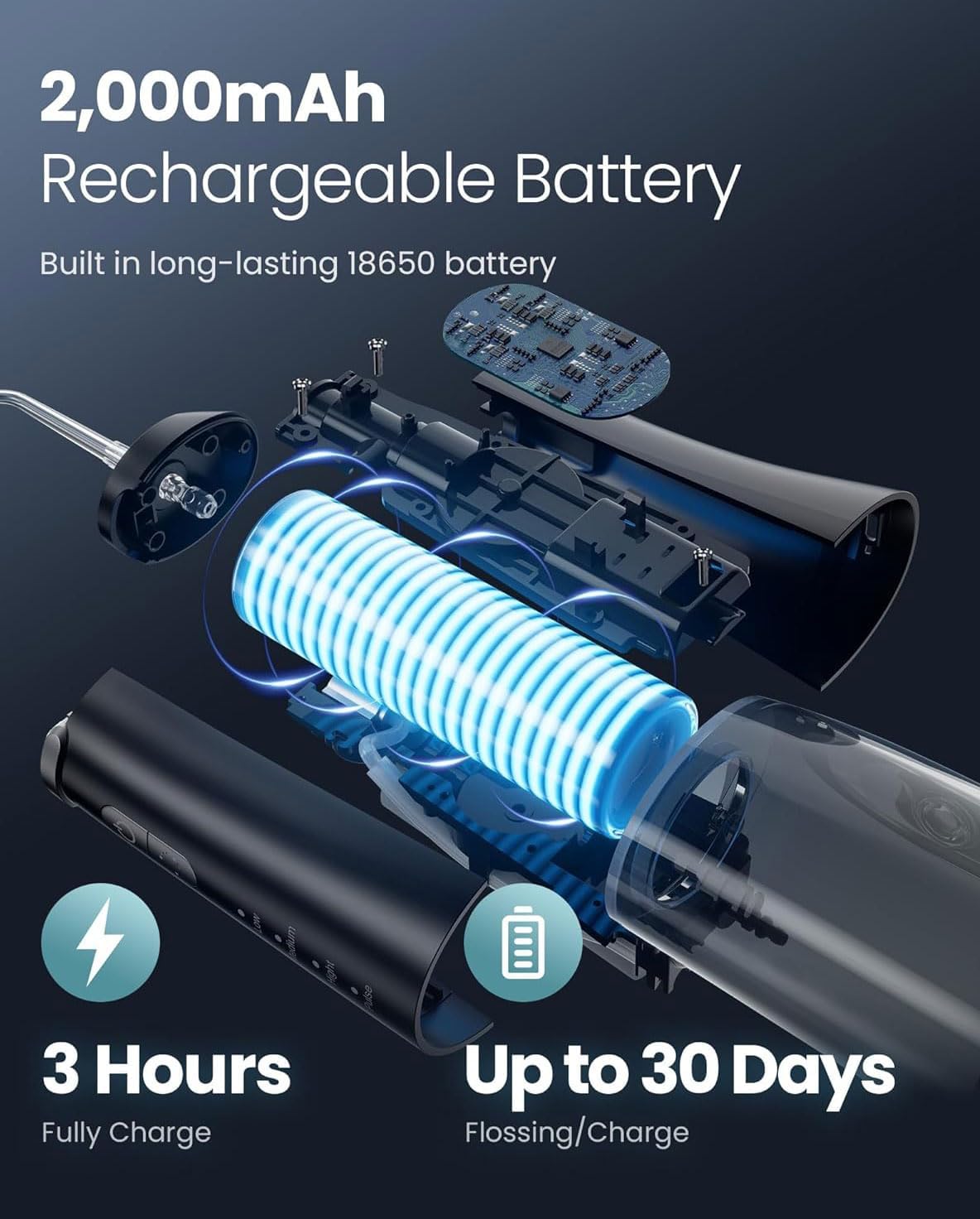 - סוללה עמידה לאורך זמן, ניידת בכל מקום: תיהנו מעד 30 ימי שימוש בטעינה של 3 שעות עם חוט דנטלי קומפקטי וקל משקל זה. אידיאלי לבית או לנסיעות. מגיע עם כבל טעינה (מתאם אינו כלול) לטעינה נוחה בדרכים