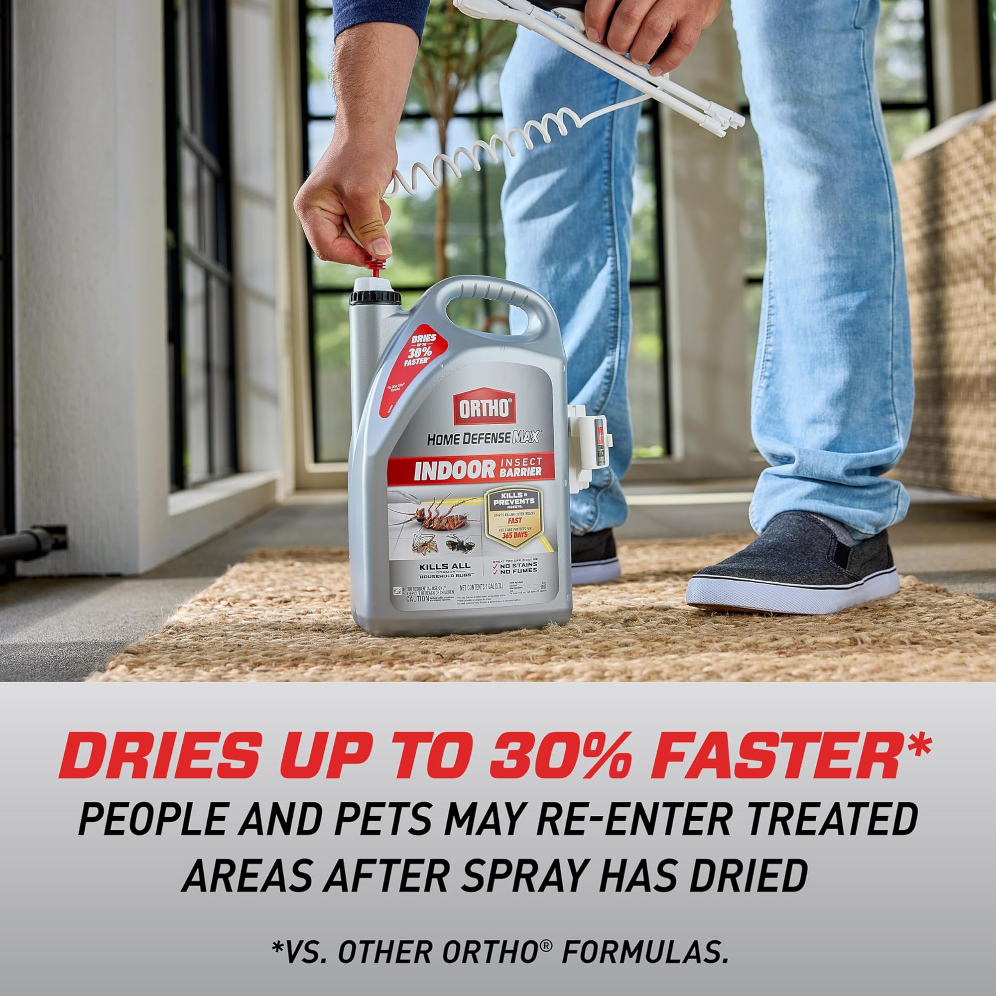 צרו מחסום מפני חרקים בעזרת תרסיס חרקים מוכן לשימוש Ortho® Home Defense Max® Indoor Indoor Insect Barrier. תרסיס חרקים זה הורג חרקים ביתיים נפוצים, כולל נמלים, ג'וקים, עכבישים, פרעושים, קרציות, עקרבים, חיפושיות, פאות אוזניים, דגי כסף, נדלים, רבי רגליים, ציקדות מחזוריות וחרקים אחרים כמפורט. נוסחה מתייבשת במהירות זו אינה מכילה אדים ואינה משאירה כתמים, כך שתוכלו להשתמש בביטחון בתוך הבית. בנוסף, הוא מתייבש עד 30% מהר יותר מנוסחאות Ortho®. השתמשו בתרסיס חרקים זה לבית בכל פעם שאתם רואים סימנים לפעילות חרקים או בכל עת כמחסום מונע כדי למנוע כניסת חרקים. למריחה, חברו את שרביט הנוחות Extended Reach Comfort Wand®. החזיקו את המרסס במרחק של 30 ס"מ מהמשטח ומרחו ברצועה של 10 ס"מ ליישומים פנימיים או ברצועה של 30 ס"מ ליישומים חיצוניים, תוך ריסוס עד שהמשטח רטוב מעט אך לא ספוג. חזרו על יישומים חיצוניים של Ortho® Home Defense Max® Insect Barrier כל 3 חודשים לקבלת התוצאות הטובות ביותר. אנשים וחיות מחמד רשאים להיכנס לאזורים שטופלו לאחר שהתרסיסים התייבשו. סמכו על Ortho® שישמור על כניסת חרקים לביתכם.