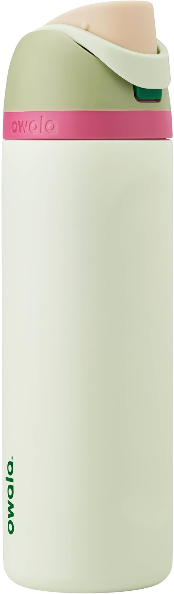 The Owala FreeSip Insulated Stainless-Steel Water Bottle with Locking Push-Button Lid easily tackles every thirst. With a built-in, easy-clean straw and a wide-mouth opening, the FreeSip reusable bottle is designed for drinking two different ways: sipping upright through the straw or tilting back to swig from the wide-mouth spout opening. Add in a push-to-open lid and playful colors, and staying hydrated has never been simpler—or more fun. Additional features include double-wall insulated stainless steel that keeps drinks cold up to 24 hours, a carry loop that doubles as a lock, a cup holder-friendly base, and a wide opening for easy cleaning and adding ice. The Owala FreeSip Insulated Stainless-Steel Water Bottle with Locking Push-Button Lid is available in three sizes: 24-Ounce, 32-Ounce, and 40-Ounce. Lid is dishwasher safe; hand wash cup. Not for use with hot liquids. Manufacturer’s limited lifetime warranty.