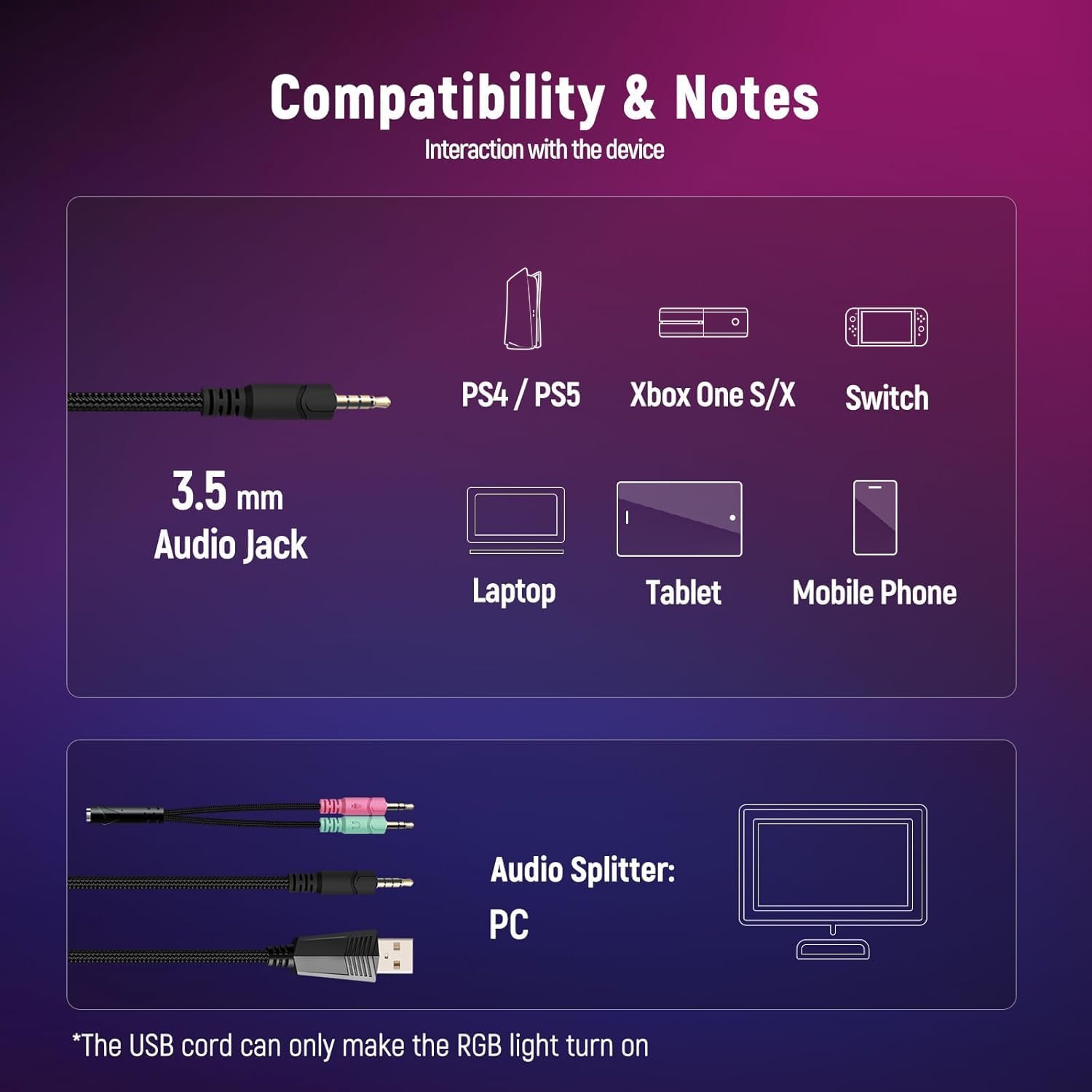 - תאימות לפלטפורמות גיימינג: אוזניות גיימינג אלו תומכות במחשב, Ps5, Ps4, Xbox חדש, Xbox Series X/S, Switch, מחשב נייד, iOS, טלפון נייד, תואמות לקונסולות מיקרו, GEM Box, Atari 2600 Sega Master System, Sega Genesis, Sega Systems, Sega Game Gear ומכשירים אחרים עם שקע 3.5 מ"מ. (שימו לב שאתם זקוקים למתאם נוסף של Microsoft בעת חיבור לבקר Xbox One ישן.)