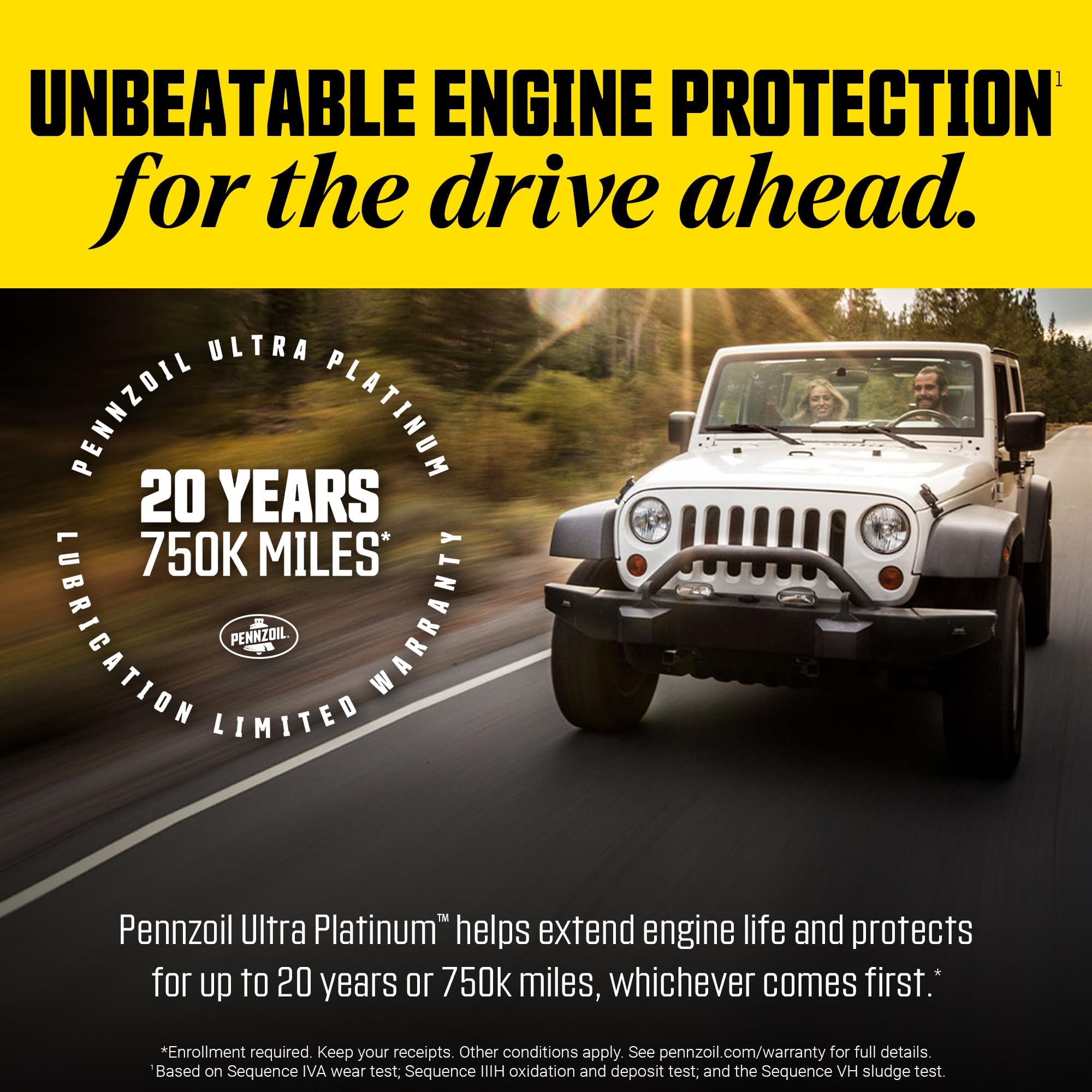 - Pennzoil Ultra Platinum מגיע עם אחריות ל-20 שנה ול-1200,000 ק"מ** כדי להגן על המנוע שלך ולתת לך שקט נפשי לנהוג בכל ק"מ בצורה החזקה ביותר שאתה יכול.