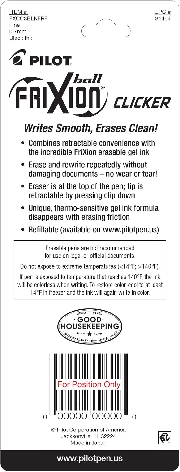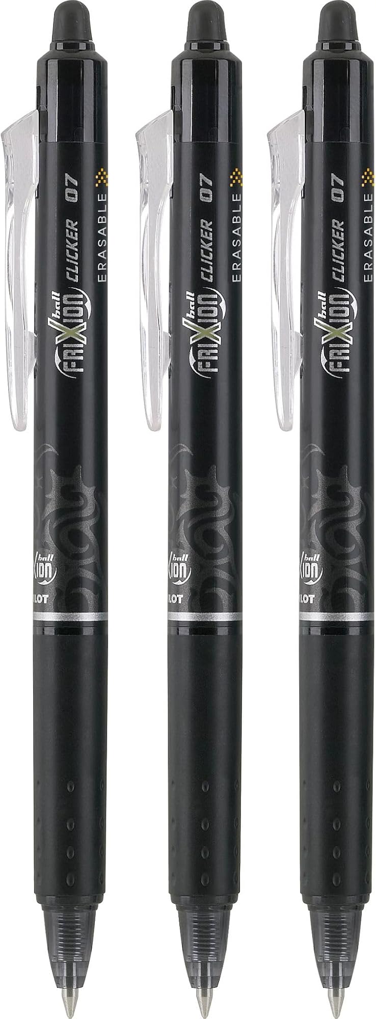 עטי PILOT FriXion Clicker מחיקים, עטי ג'ל למילוי חוזר ונשלפים, קוטר עדין 0.7 מ"מ, דיו שחור, חבילה של 3 - אידיאליים לבית הספר, לכתיבה ביומן ולכתיבה במשרד