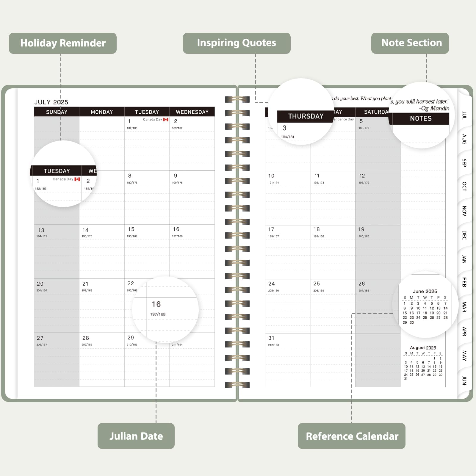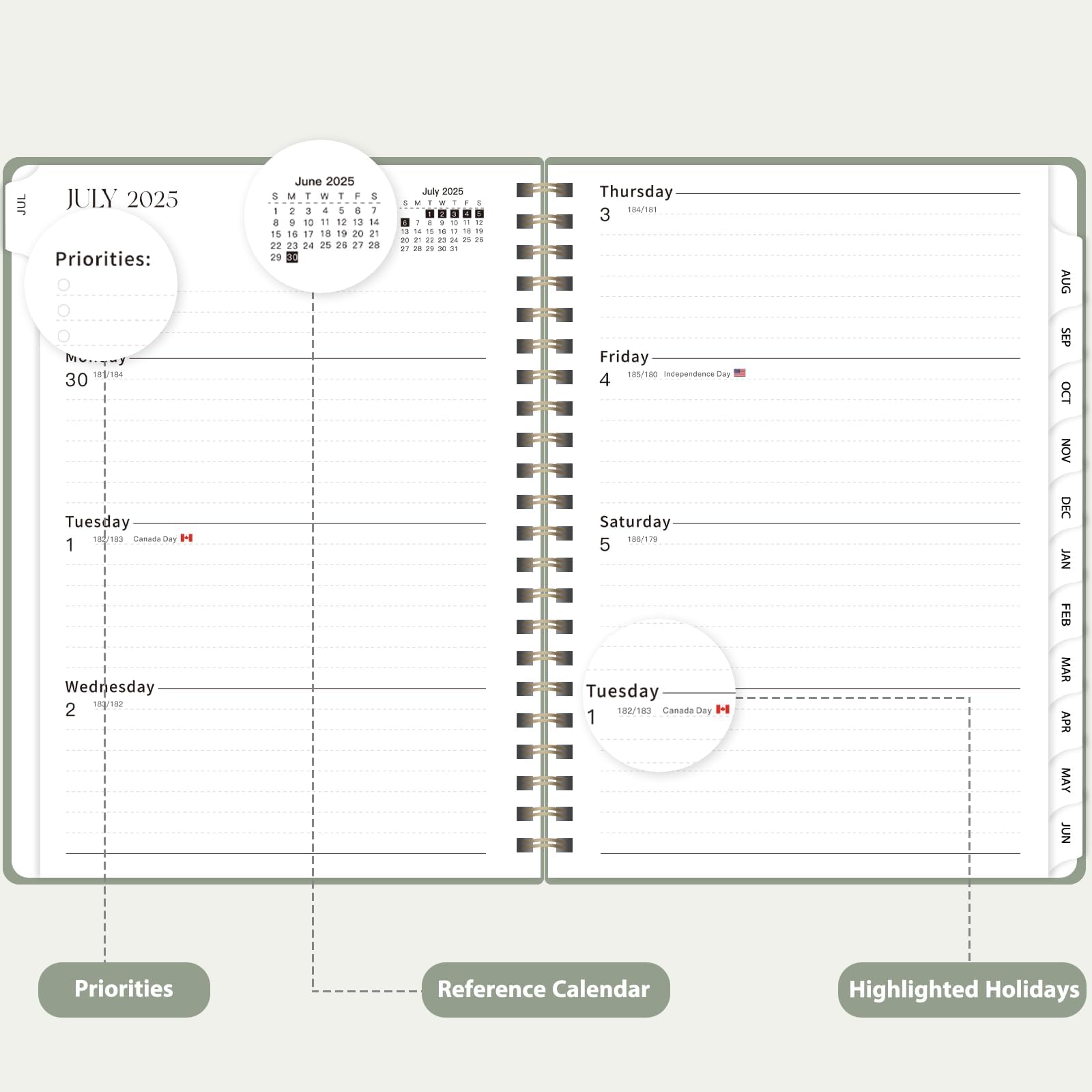מתכנן 2025-2026 לנשים וגברים, מחברת שבועית וחודשית (יולי 2025 - יוני 2026), כריכה קשה בכריכה ספירלית, מתכנן בית ספר, מורים ותלמידים עם לשוניות, כיס פנימי, A5 (6.3 אינץ' x 8.5 אינץ')