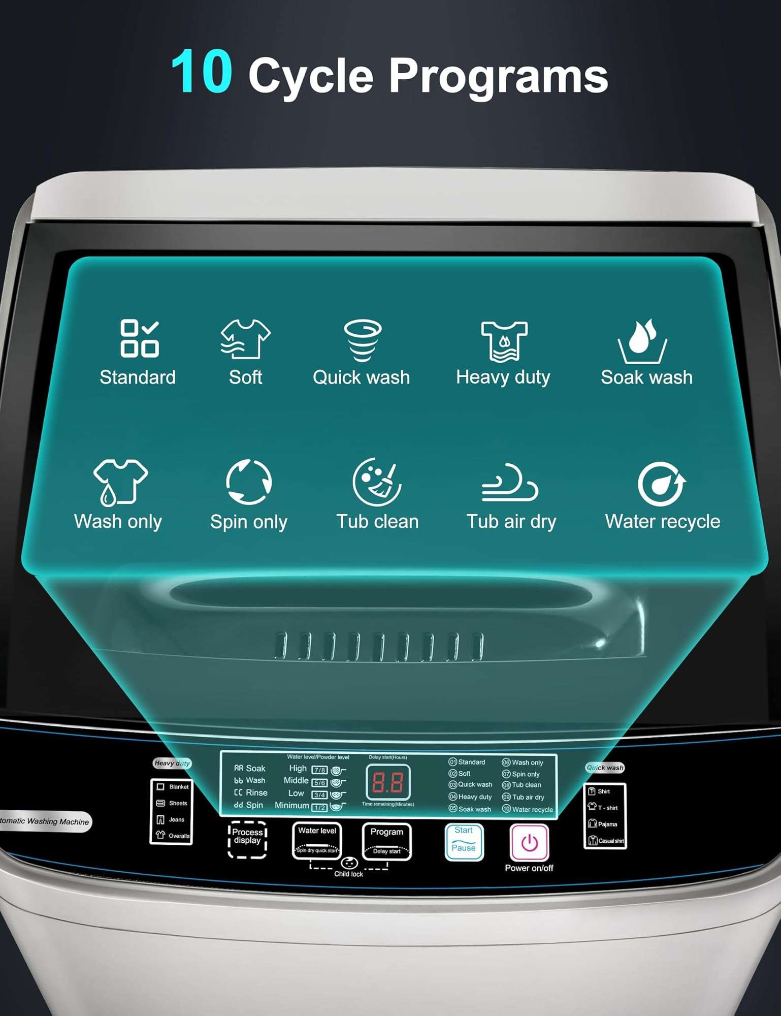 - מצבי כביסה מרובים: מכונת כביסה אוטומטית זו כוללת 10 מצבי כביסה לבחירה, המתאימים לצרכים שונים של כביסה. צג ה-LED לא רק מציג את תוכנית הכביסה שנבחרה אלא גם מספק עדכונים בזמן אמת על זמן הכביסה, מה שמבטיח שתישארו מעודכנים לאורך כל המחזור.