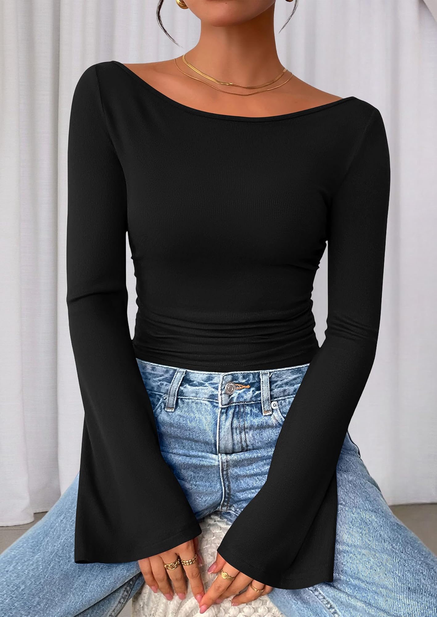 חולצות ארוכות שרוולים לנשים PRETTYGARDEN סתיו 2025 חולצות ליציאה קז'ואל צווארון סירה שרוול פעמון צלעות רוכסן בגדי שנה לנצח (שחור, בינוני)
