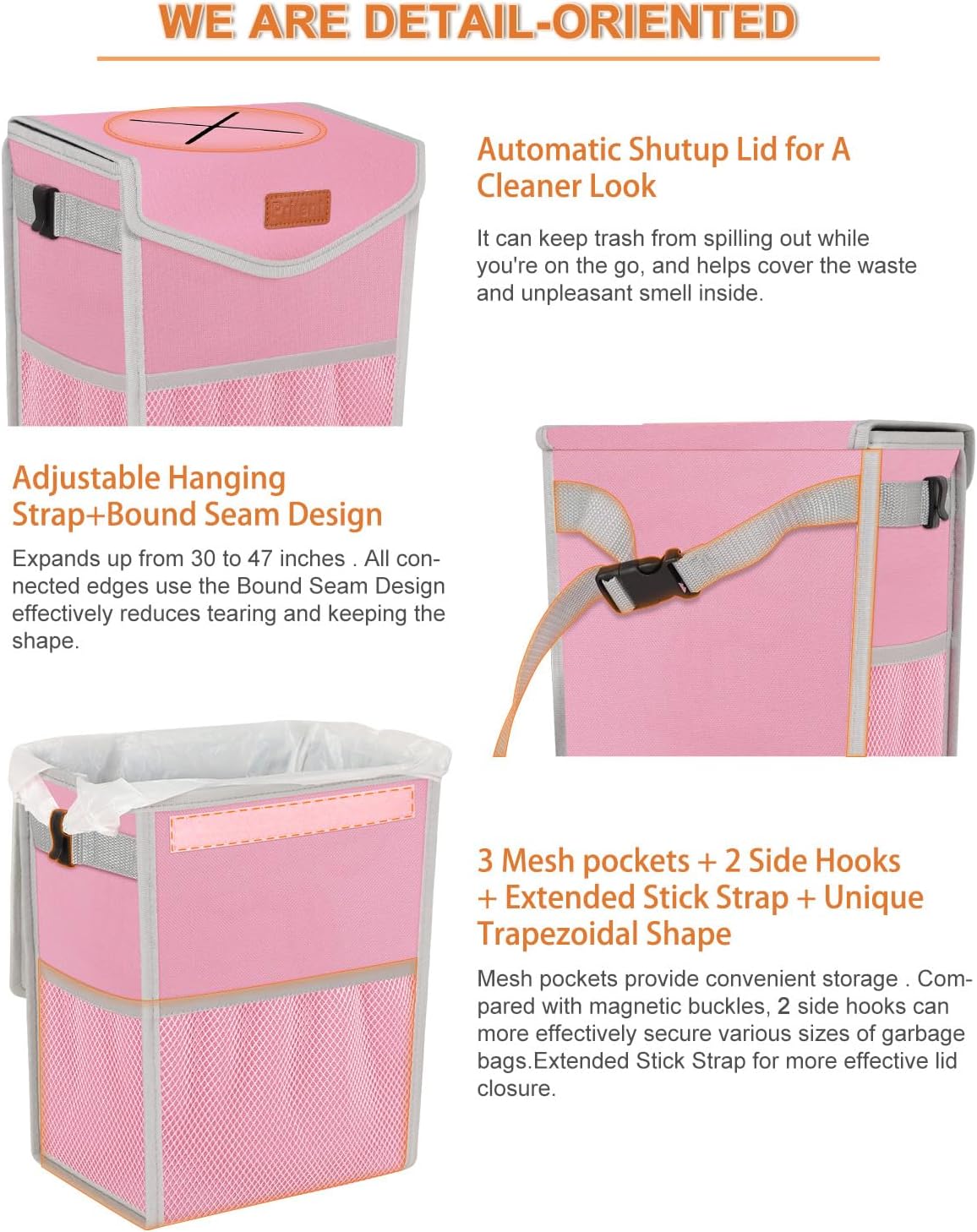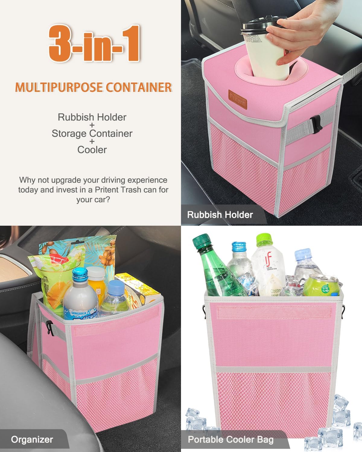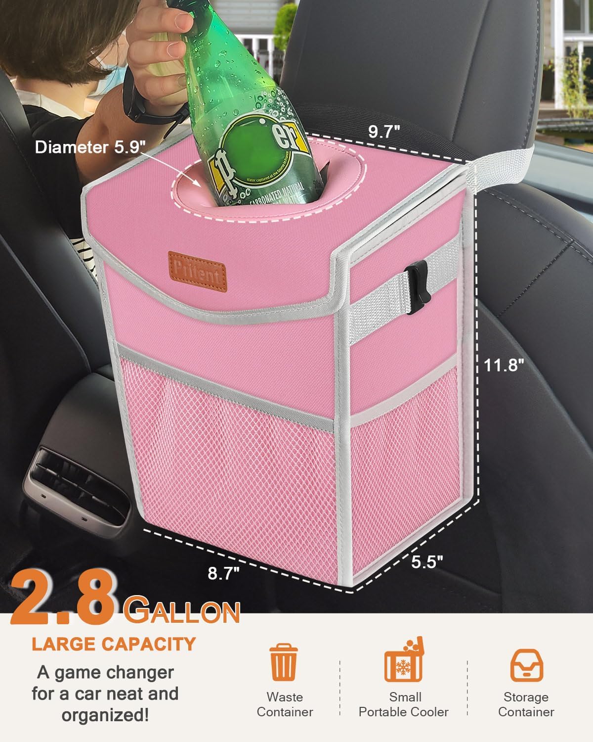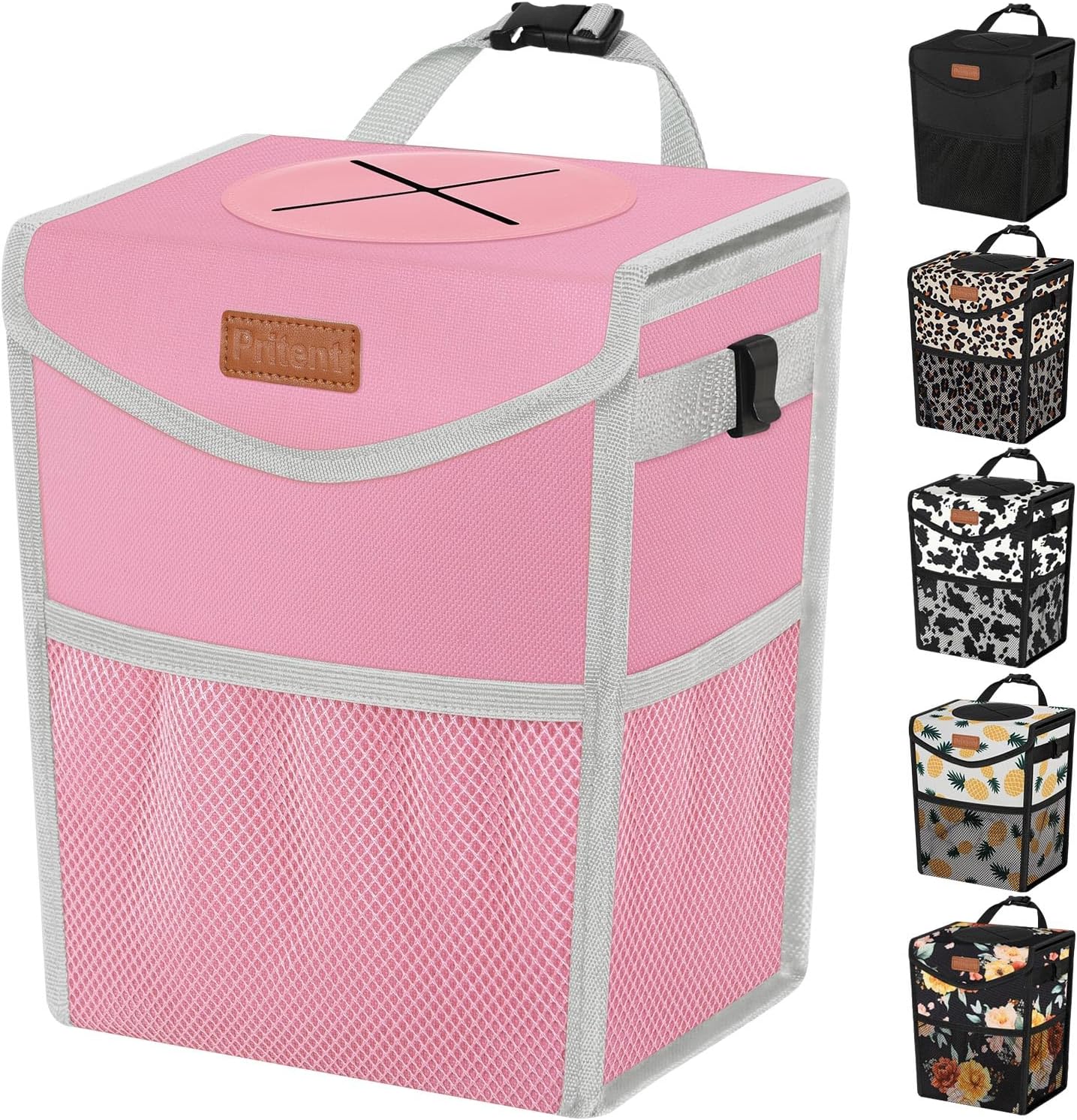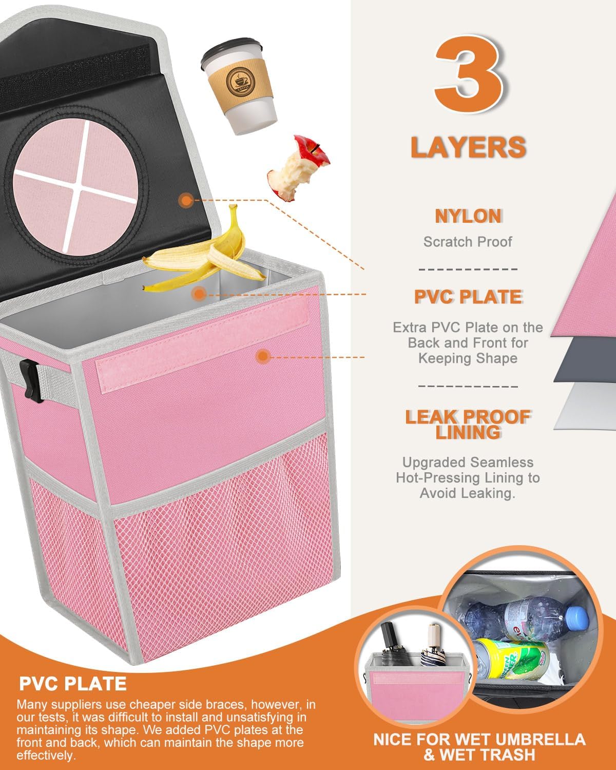 פח אשפה לרכב של Pritent עם מכסה, שקית אשפה לרכב אטומה לדליפות חמודה, פח אשפה לרכב תלוי, פח אשפה קטן ונייד לרכב, מארגן למושב האחורי/קדמי/קונסולה (2.8 גלונים, ורוד)